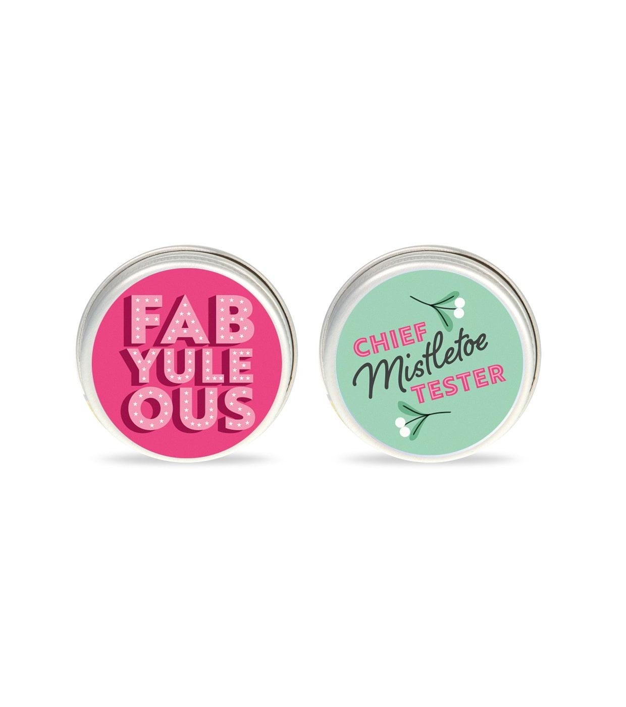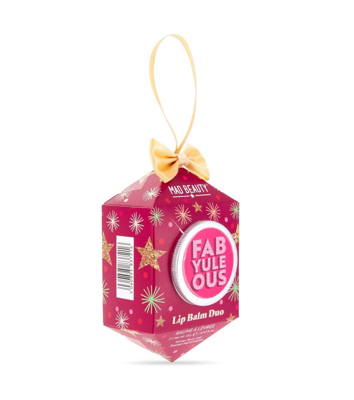 Un dúo hidratante de bálsamos labiales nutritivos en botes decorativos con atrevidos eslóganes festivos, presentados en una caja de doble cara inspirada en una chuchería para adornar el árbol de Navidad.