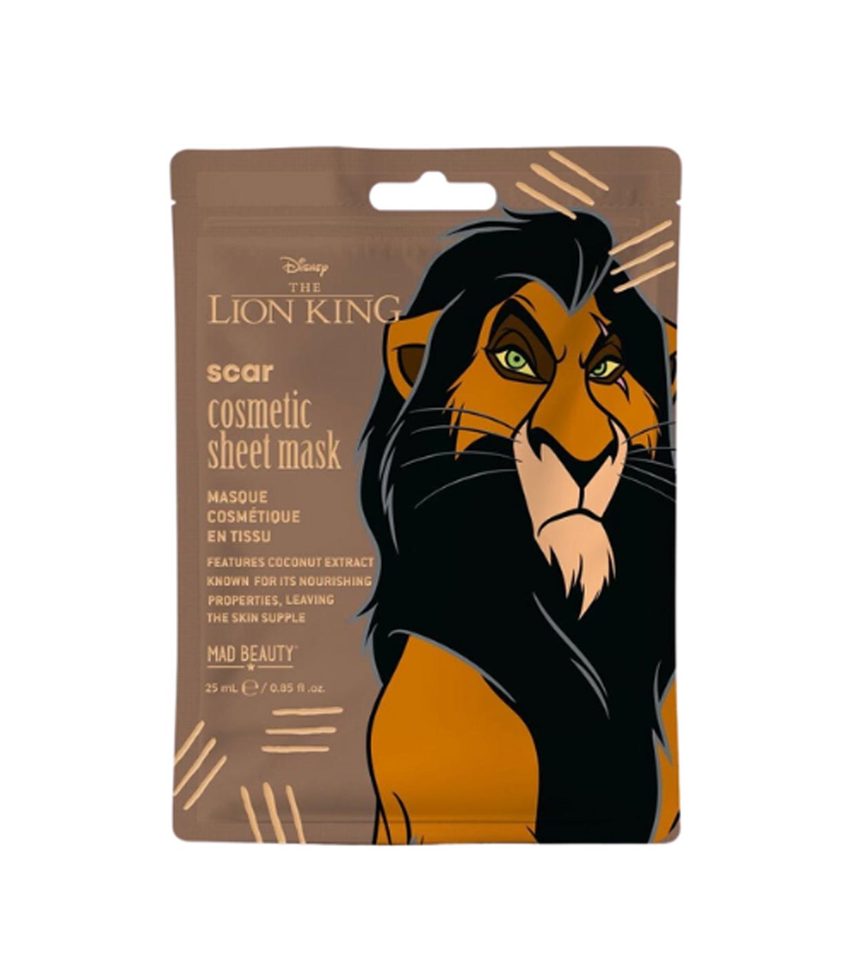 Mascarilla facial Scar con extracto de coco de la colección The Lion King de Mad Beauty.