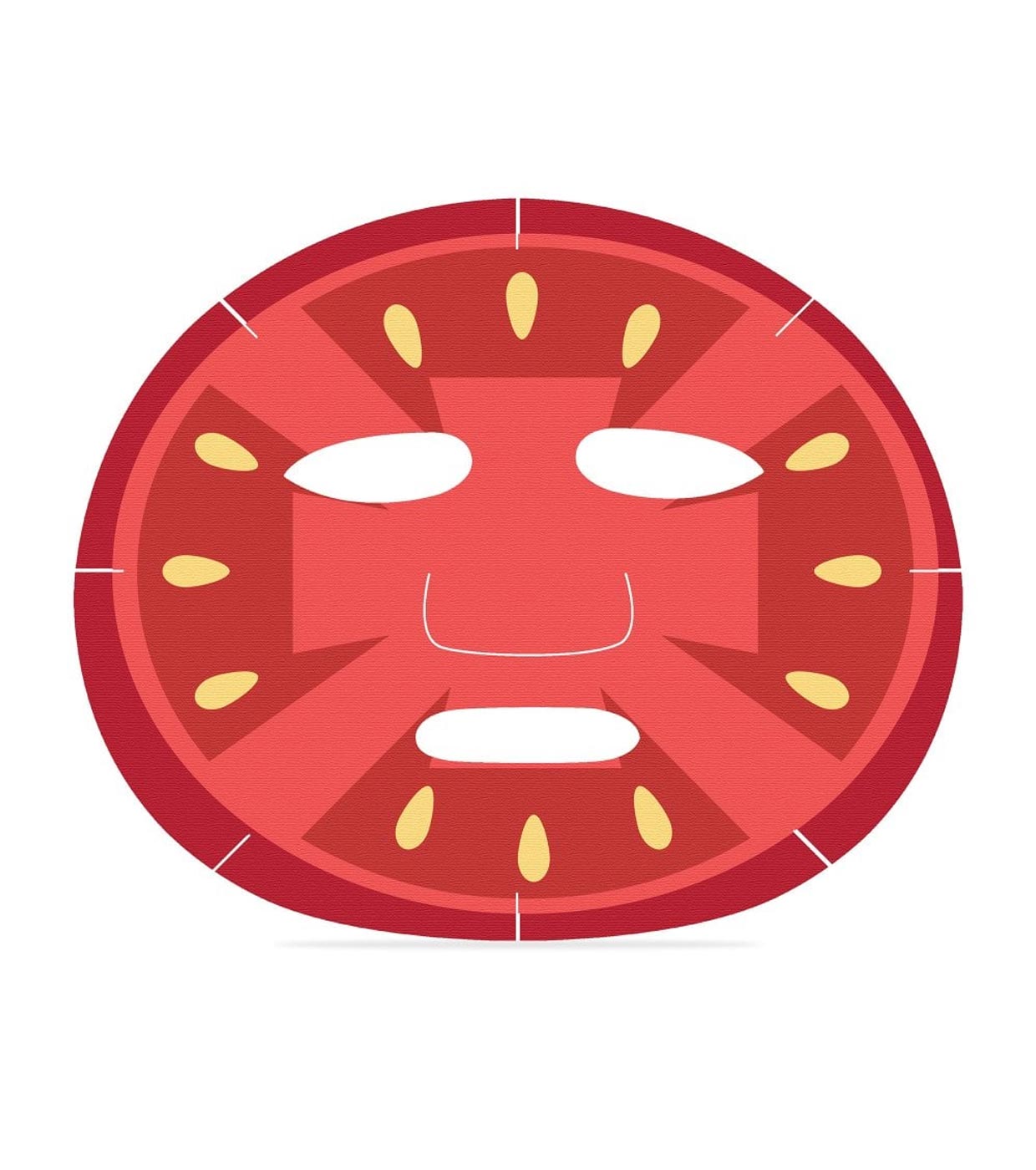 Esta bonita mascarilla cosmética con estampado de tomate está elaborada con una fibra biodegradable de origen vegetal impregnada en un suero con ácido hialurónico hidratante y una refrescante fragancia de aloe vera.