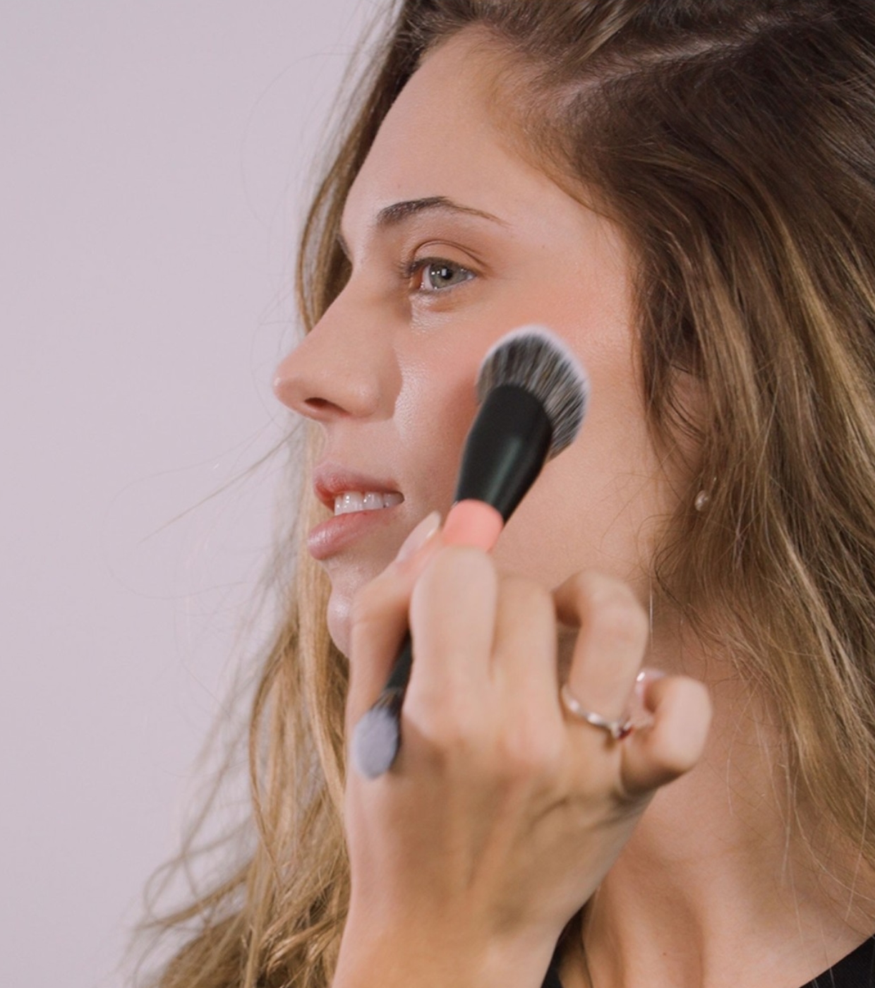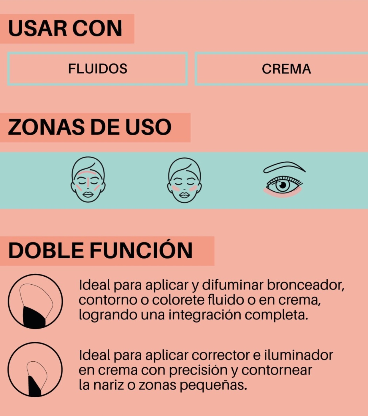 - Extremo ancho: Aplicar y difuminar bronceador o contorno en crema gracias a su forma biselada. Aplicar colorete fluido o en crema con ligeros toques.