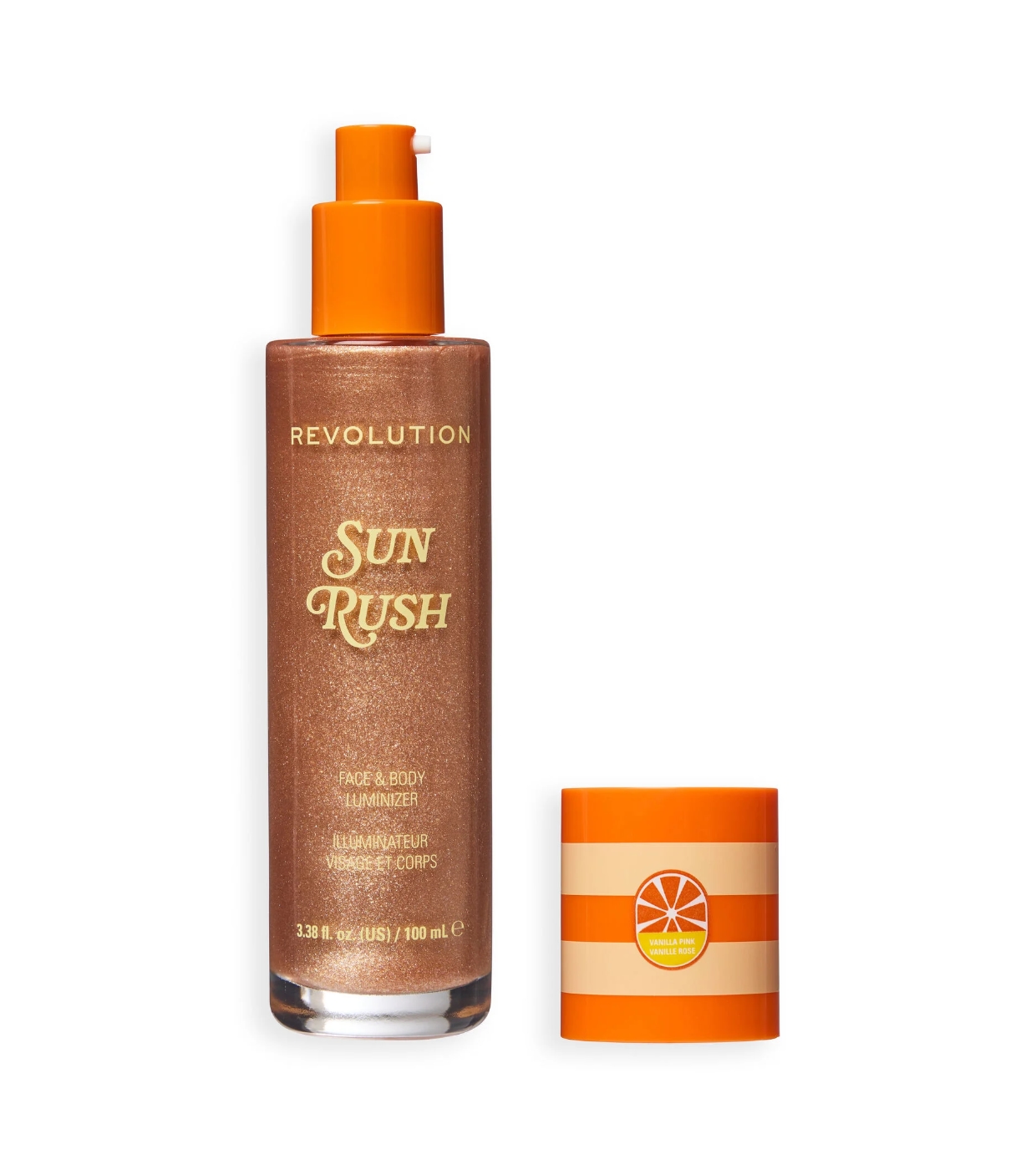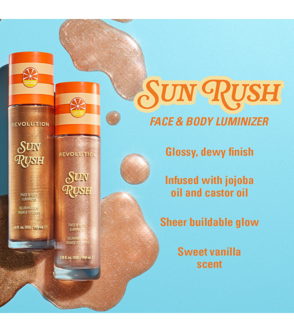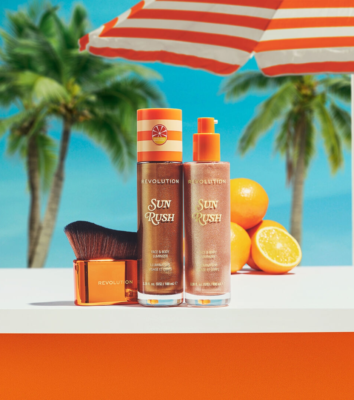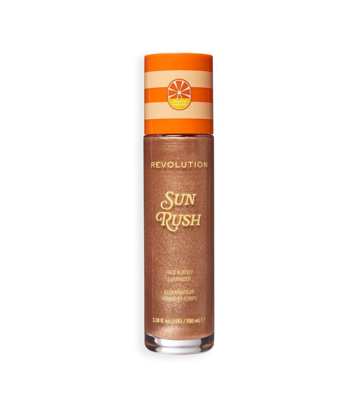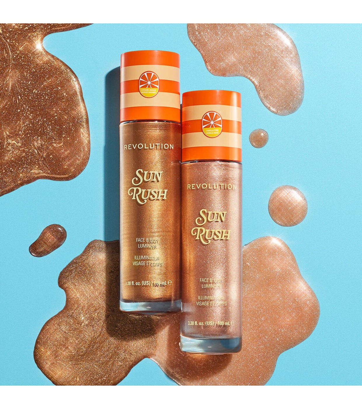 Consigue un brillo jugoso y radiante de pies a cabeza con el Iluminador corporal Sun Rush de Revolution que se funde perfectamente con la piel.