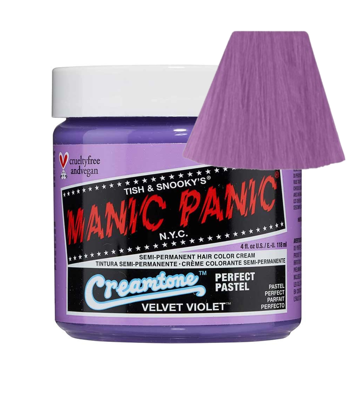 El Manic Panic High Voltage en el tono Velvet Violet es un tinte fantasía semipermanente vegano con un suave acabado violeta malva pastel.