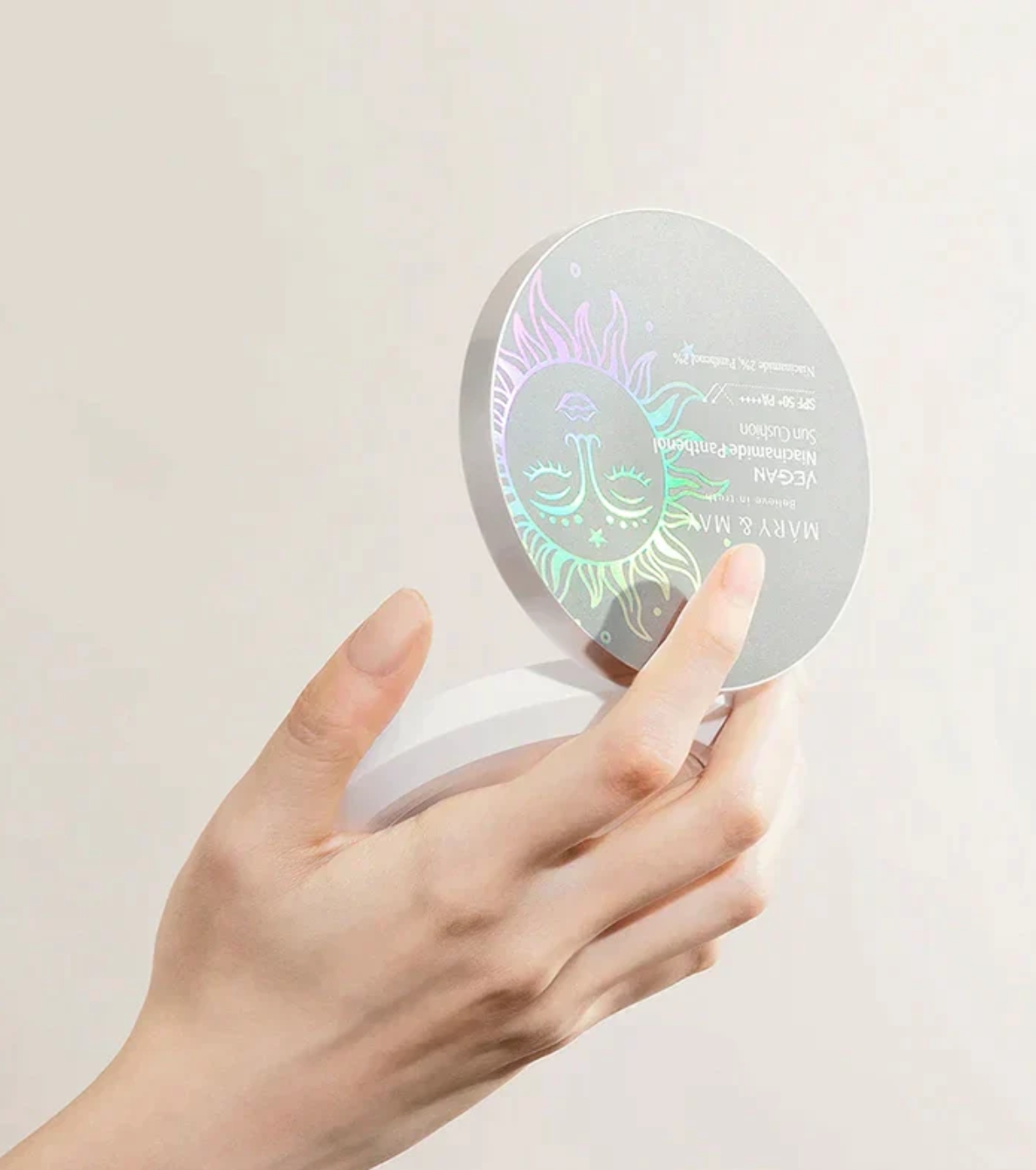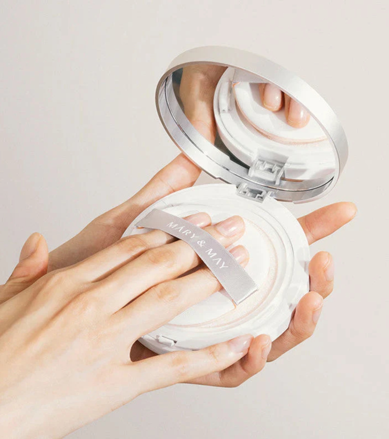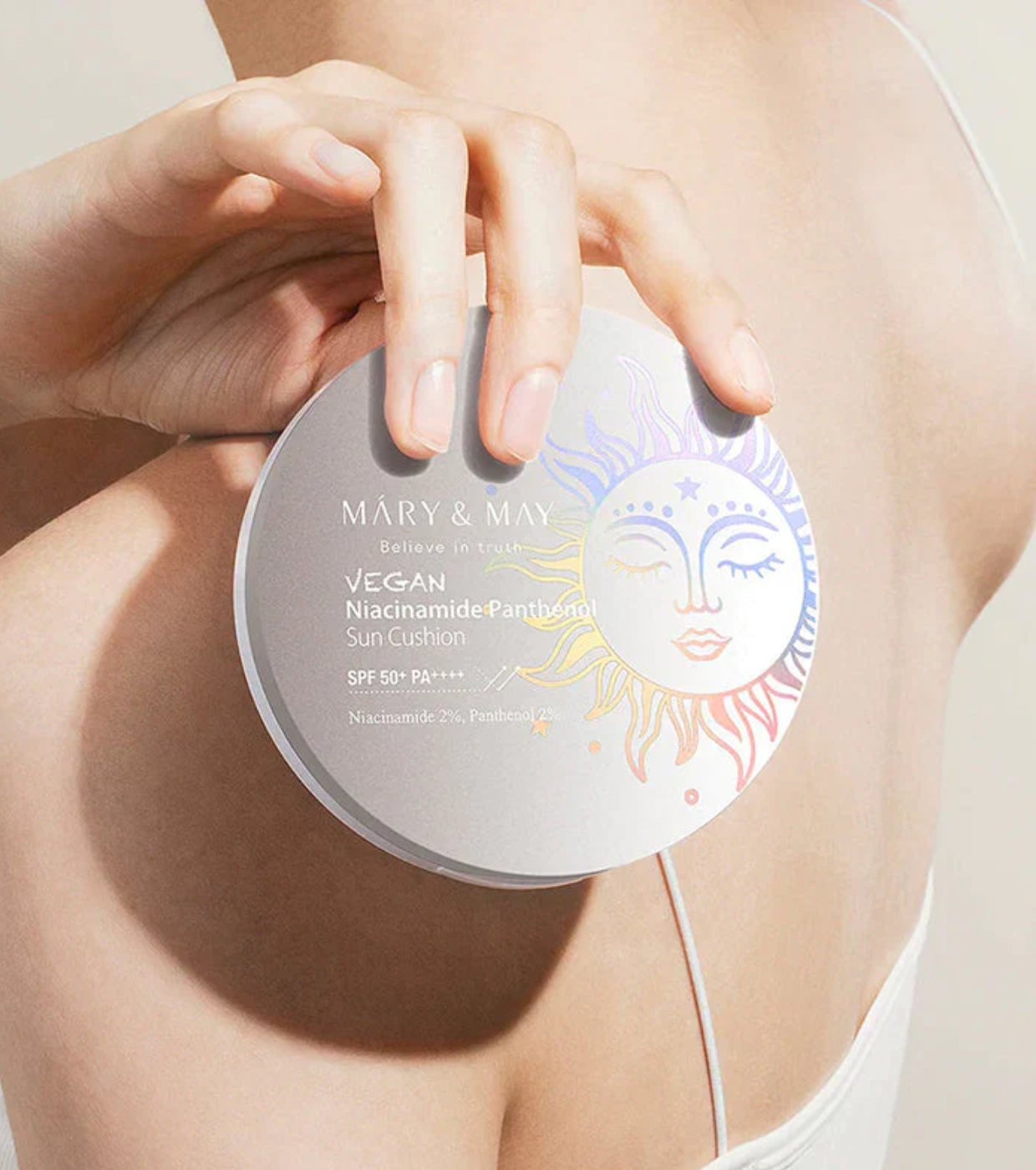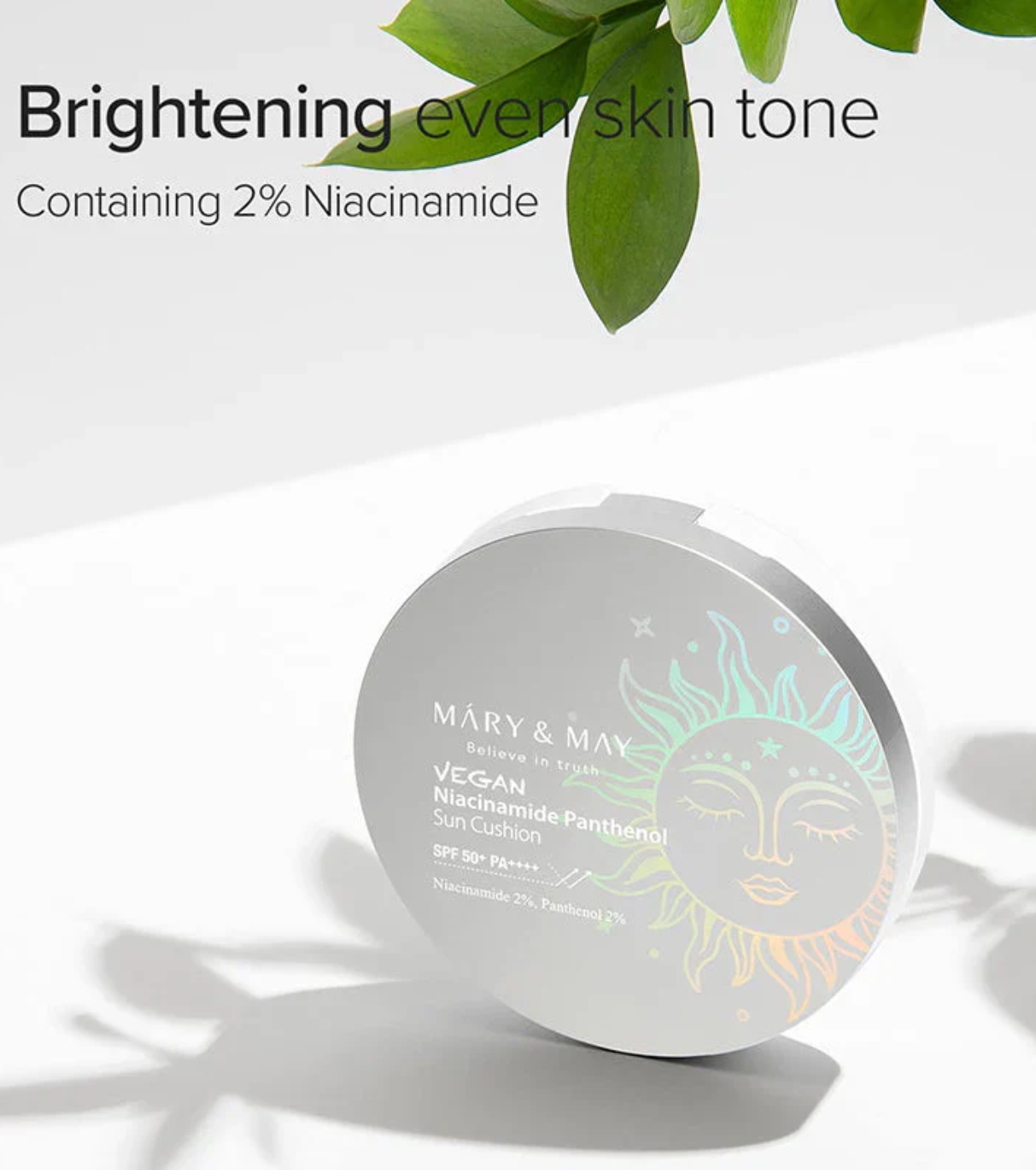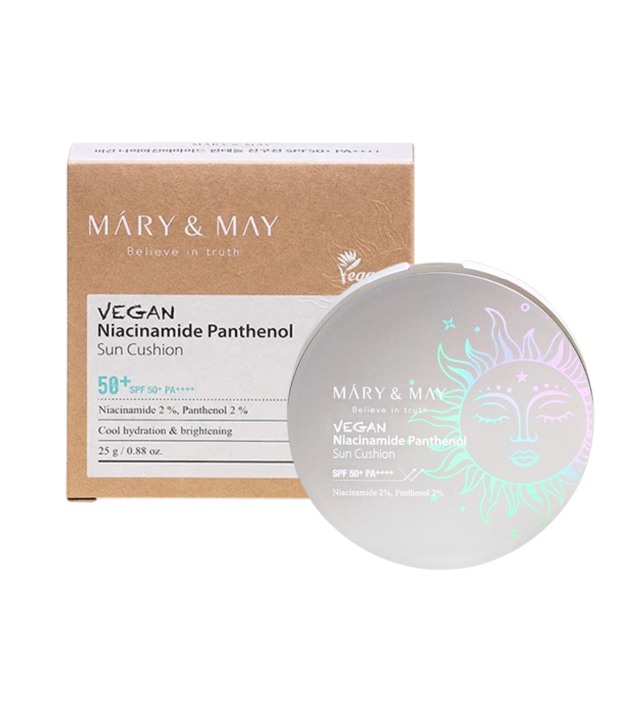 Descubre el equilibrio perfecto entre protección solar eficaz y cuidado de la piel con el protector solar en cushion de MARY & MAY, enriquecido con niacinamida, pantenol y ácido hialurónico.