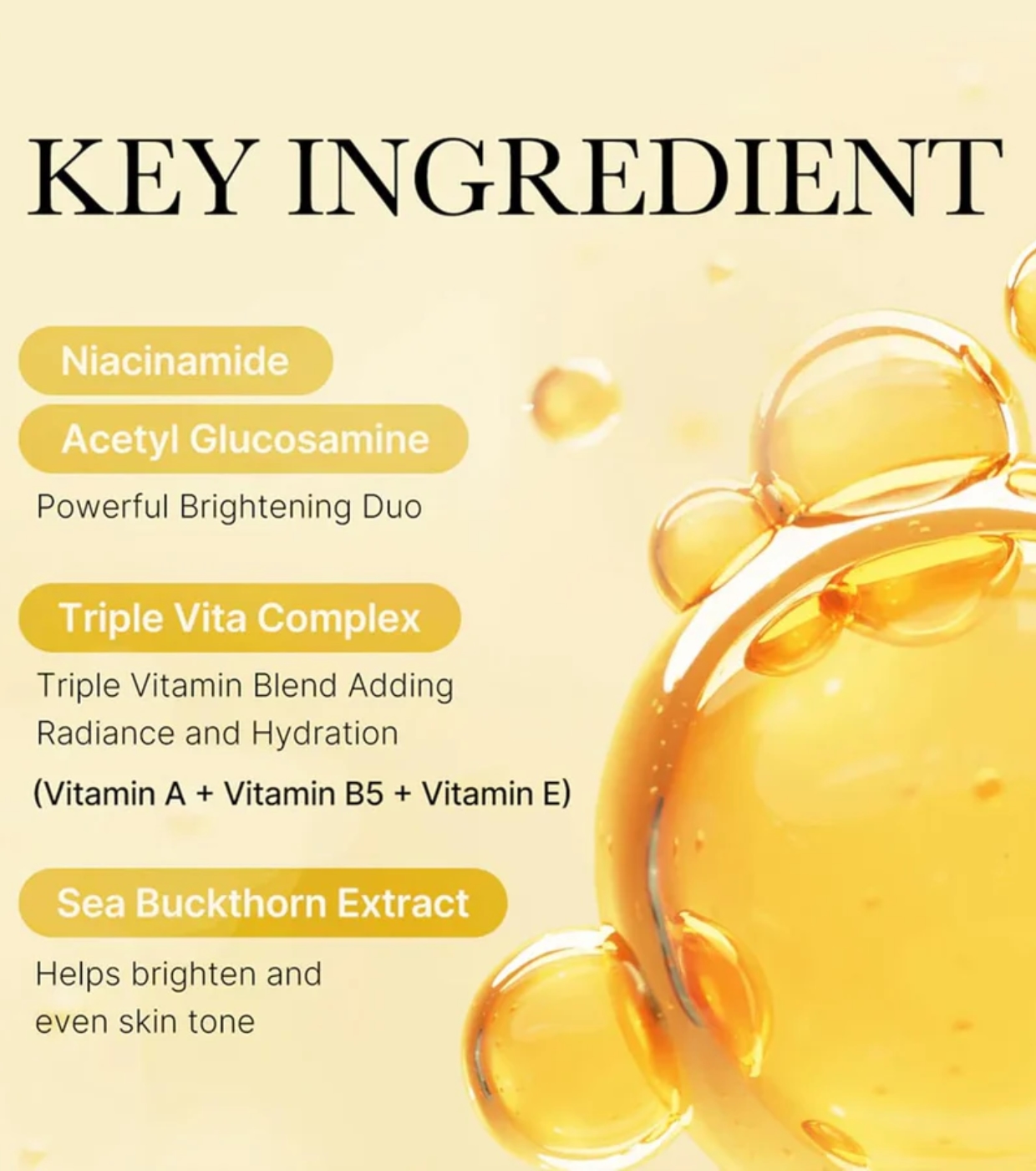 Con un 30% de agua de árbol de la vitamina (Hippophae Rhamnoides) y un cóctel de niacinamida y acetil glucosamina, esta mascarilla no solo ilumina, sino que también hidrata profundamente, calma la piel y refuerza la barrera cutánea, ofreciendo beneficios antioxidantes y rejuvenecedores.