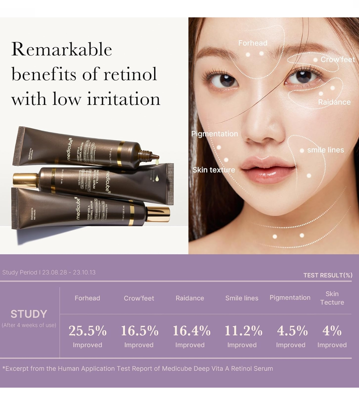 Rejuvenece tu piel con el sérum con Retinol y Vitamina C Deep Vita A de Medicube, un sérum intensivo formulado con retinol (vitamina A), uno de los ingredientes más eficaces para combatir los signos del envejecimiento.
