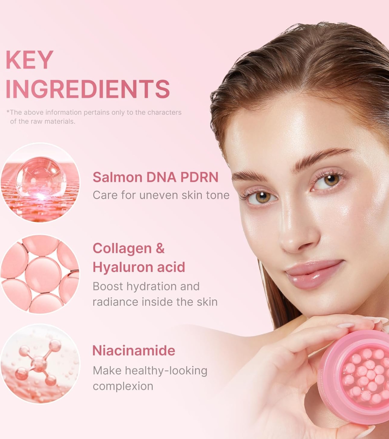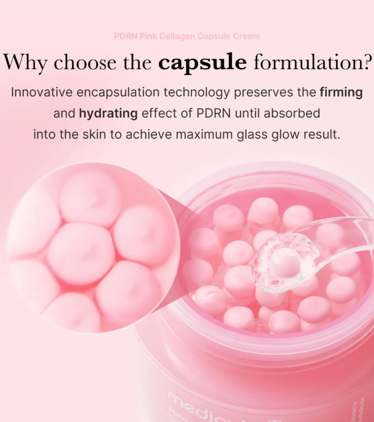 Las cápsulas rosas preservan los beneficios reafirmantes e hidratantes del PDRN hasta su absorción, maximizando la eficacia del tratamiento y dejando la piel visiblemente más jugosa.