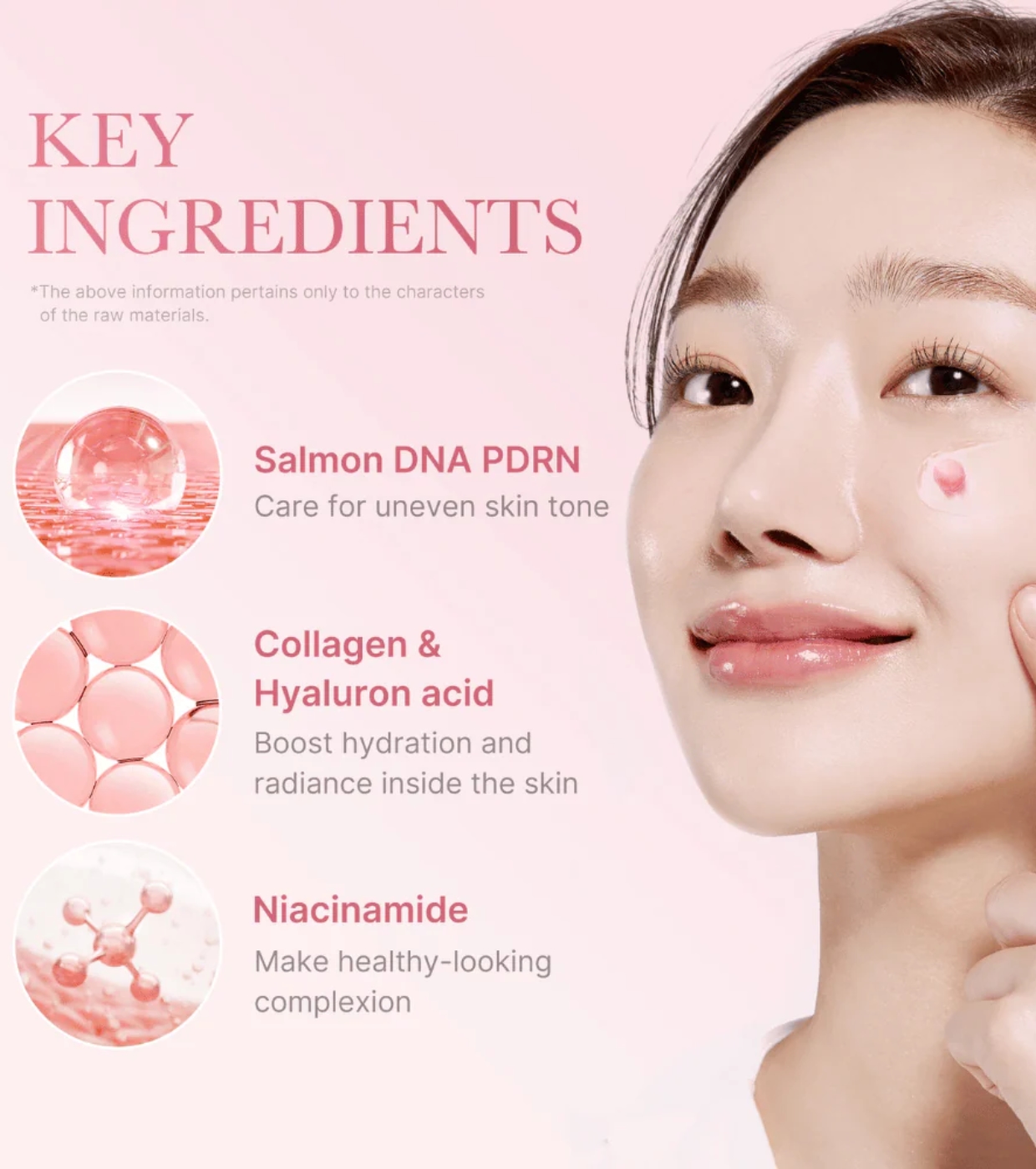El PDRN (ADN de salmón) ayuda a unificar el tono y mejorar el aspecto general de la piel, mientras que el colágeno y el ácido hialurónico aumentan la hidratación y la elasticidad.