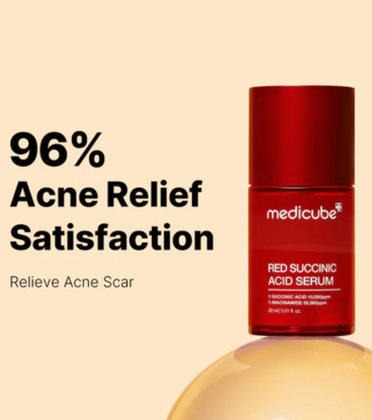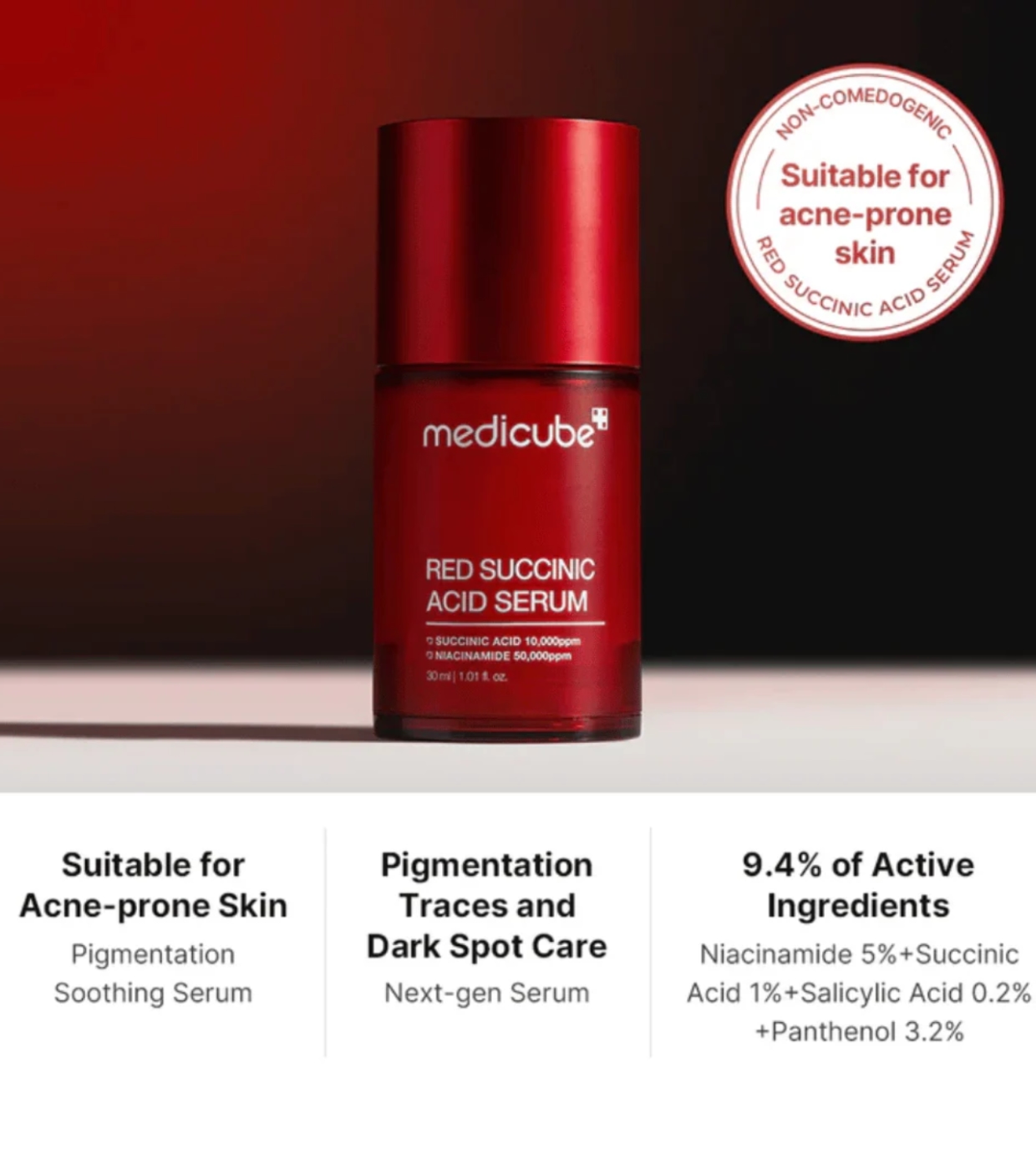 Aclara y equilibra tu piel con el Medicube Red Succinic Acid Clarifying Serum, un sérum exfoliante no comedogénico e hipoalergénico, especialmente formulado para pieles propensas al acné, sensibles o desequilibradas.