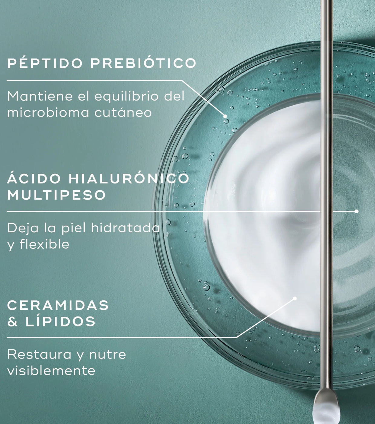 Hidratación profunda AM/PM con H.E.O. y péptidos prebióticos.