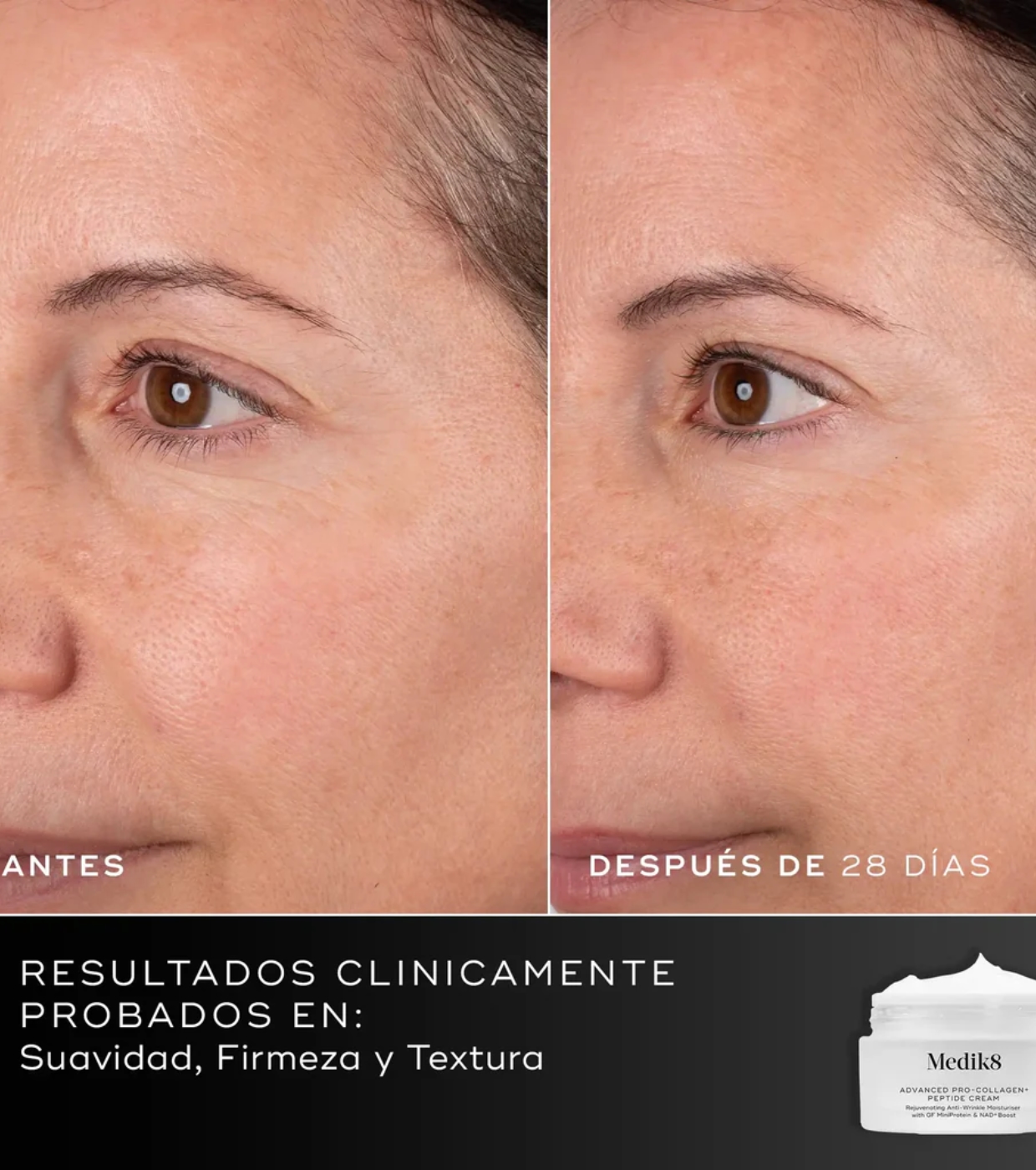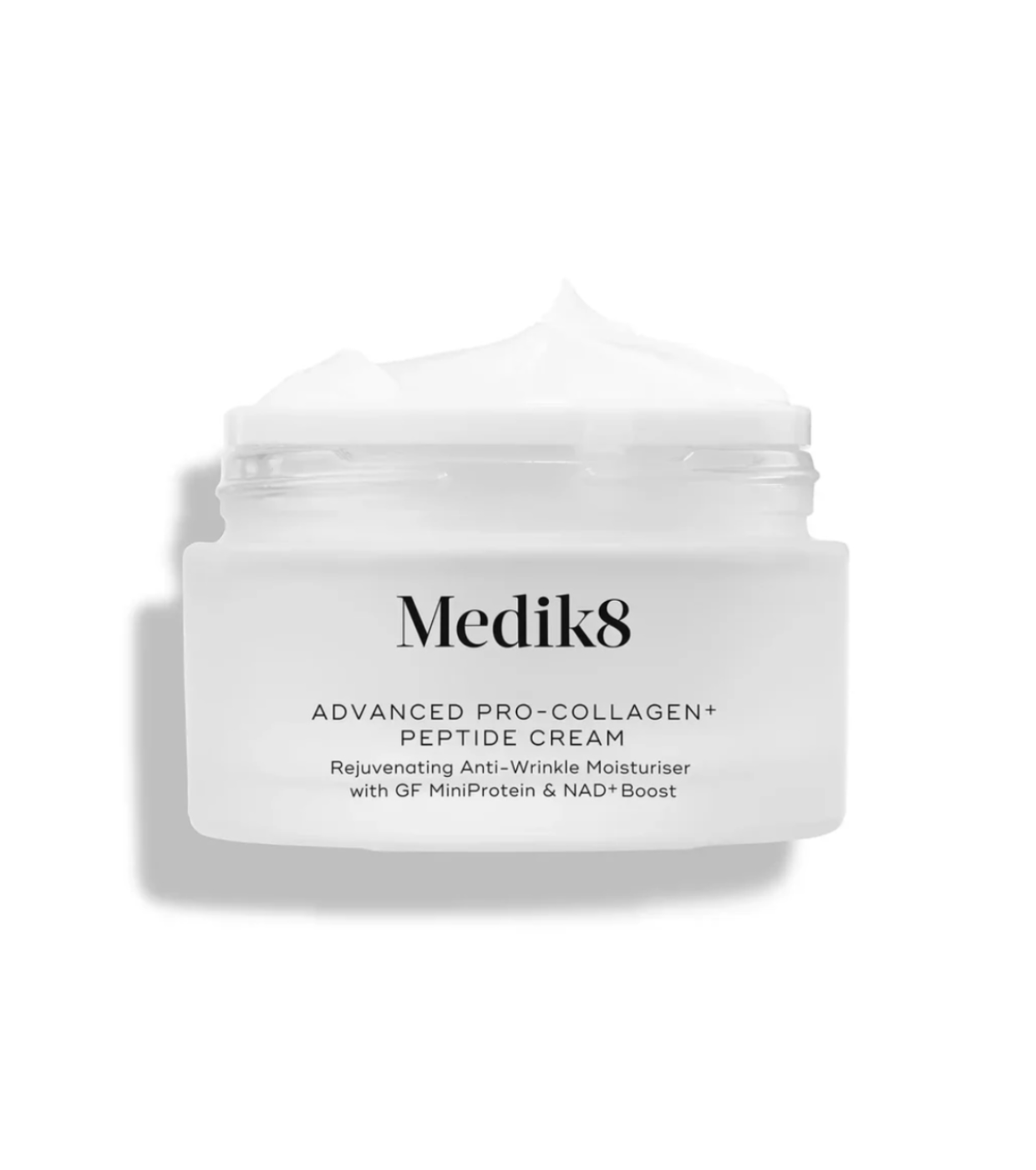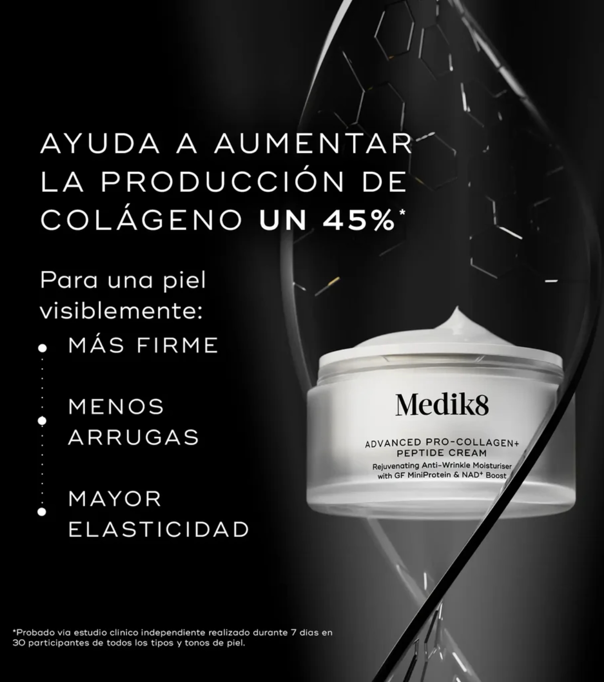 Advanced Pro-Collagen+ Peptide Cream de Medik8 es la crema antiedad de alto rendimiento que impulsa la producción de colágeno hasta en un 45 %1 y promueve la longevidad óptima de la piel.