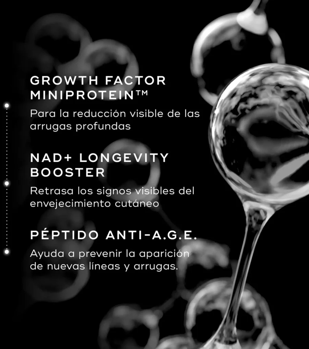 Impulsada por la ciencia regenerativa, combina activos de última generación como Growth Factor MiniProtein™, el potenciador de la longevidad NAD+ y el péptido Anti-A.G.E., que trabajan en sinergia para restaurar la estructura cutánea y lograr una piel más tersa, esculpida y visiblemente más joven.