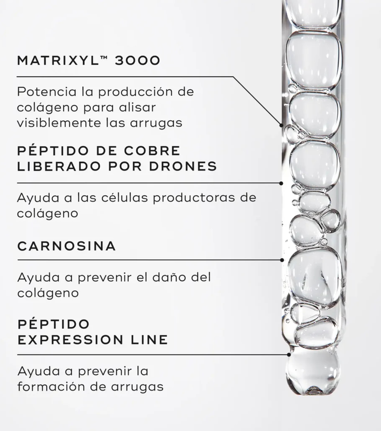 Altamente eficaz, su poder absoluto es maximizado por un innovador sistema de administración basado en drones que garantiza que cada péptido se active dentro de la capa de piel que más se necesita.