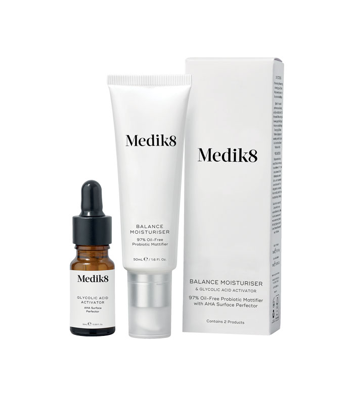 Set de crema hidratante equilibrante Balance Moisturiser y Sérum activador de Ácido Glicólico de Medik8.