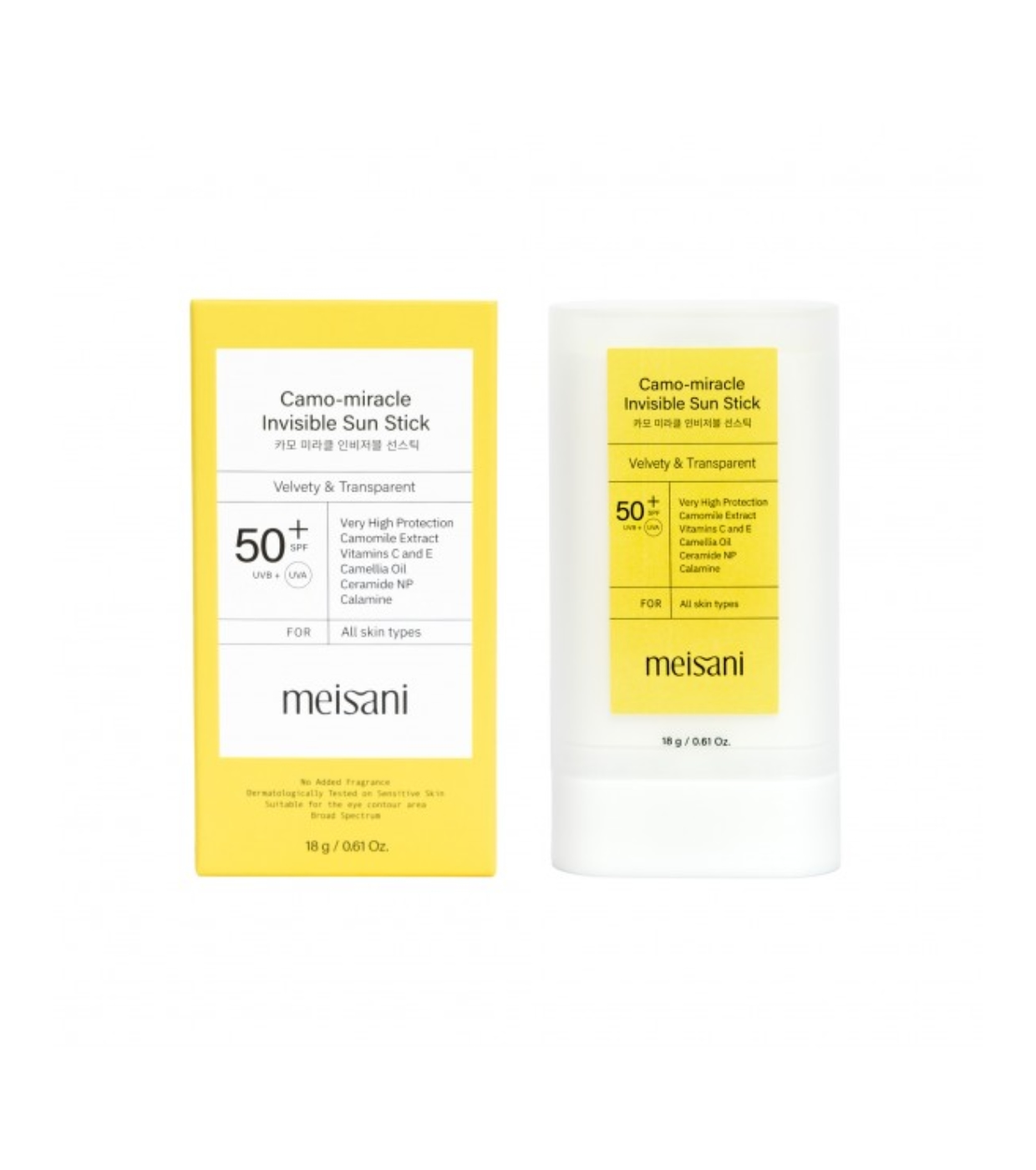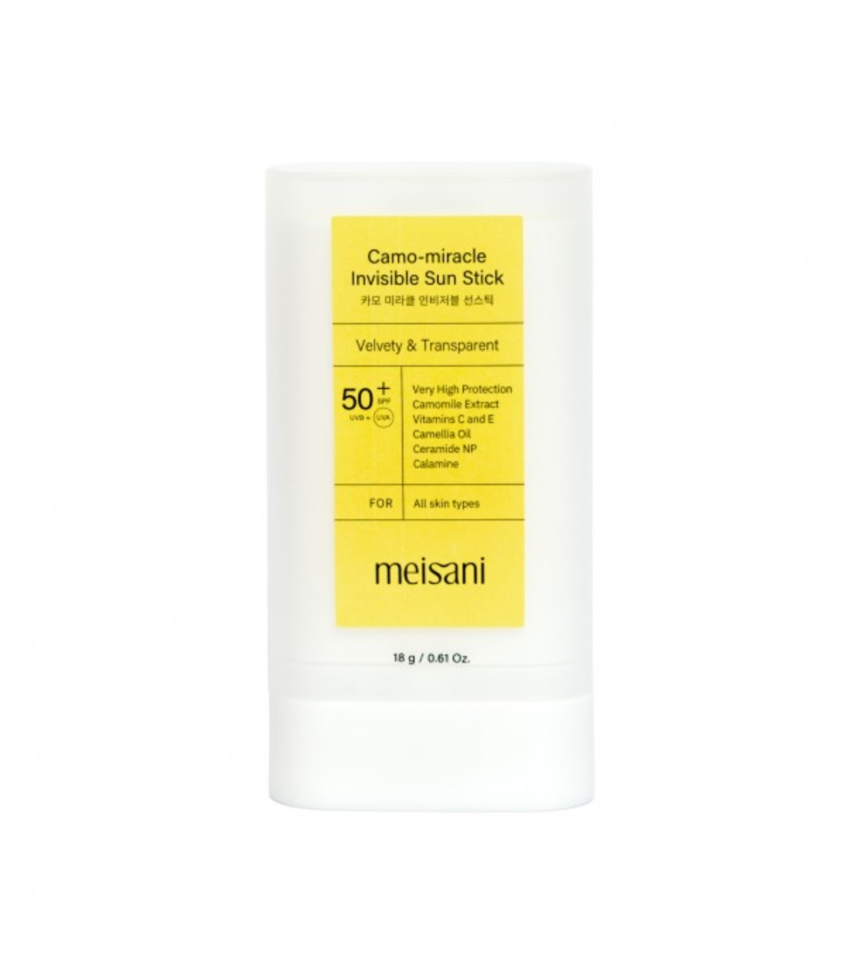 El protector solar Camo-Miracle Invisible Sun Stick SPF50 de Meisani es ideal para reaplicar protección en cualquier momento y lugar.