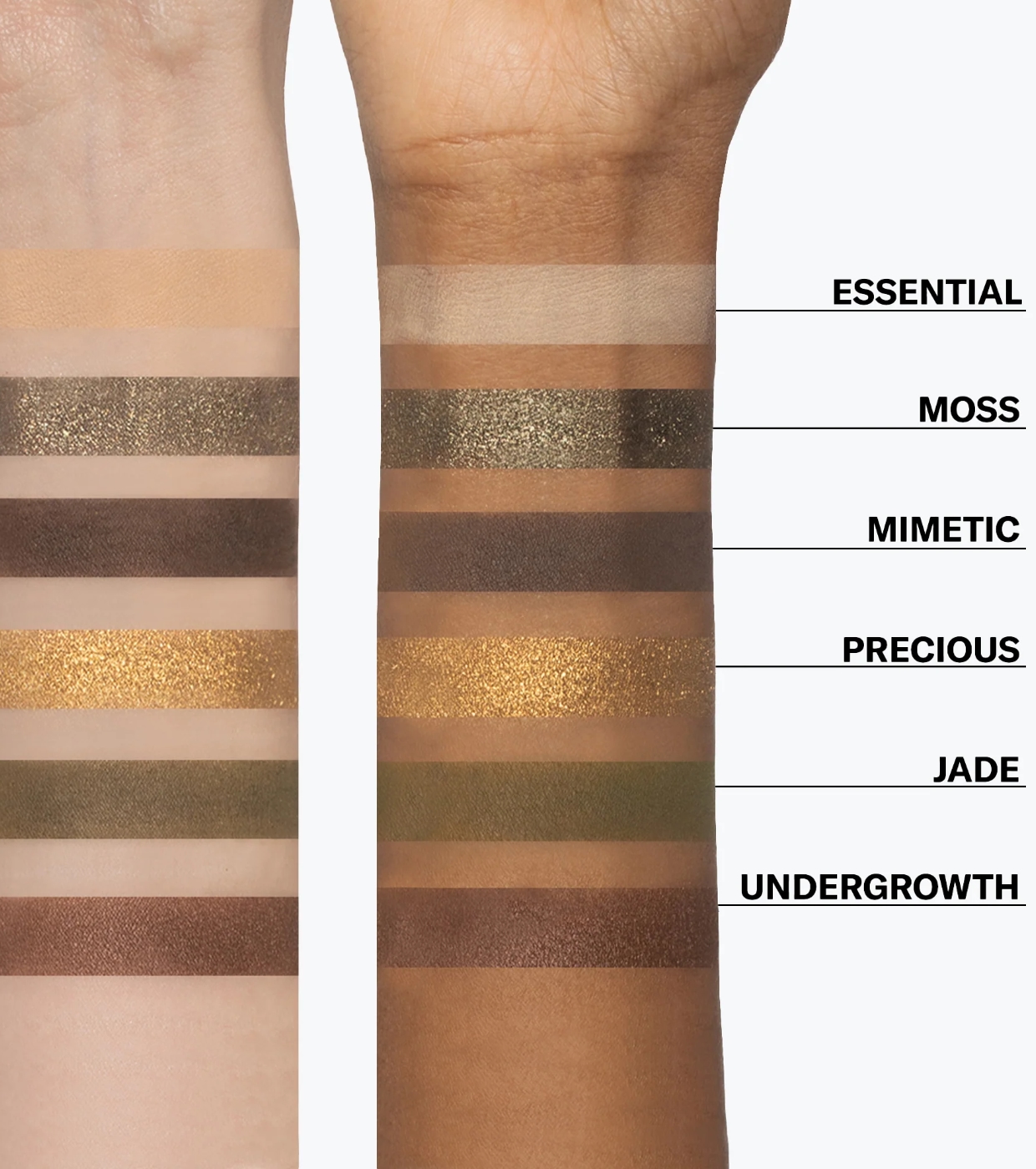 PRECIOUS (4) SYNTHETIC FLUORPHLOGOPITE, CI 77891/TITANIUM DIOXIDE, CI 77400/COPPER POWDER, MICA, DIMETHICONE, SILICA, ZINC STEARATE, DIISOSTEARYL MALATE, STEARYL DIMETHICONE, OCTYLDODECYL STEAROYL STEARATE, CALCIUM ALUMINUM BOROSILICATE, CI 77491/IRON OXIDES, TRIMETHYLSILOXYSILICATE, TIN OXIDE, ETHYLHEXYLGLYCERIN, PROPANEDIOL, DECYLENE GLYCOL, 1,2-HEXANEDIOL, CAPRYLHYDROXAMIC ACID. JADE (5) MICA, CI 77492/IRON OXIDES, CI 19140/YELLOW 5 LAKE, CI 77499/IRON OXIDES, ORYZA SATIVA POWDER/ORYZA SATIVA (RICE) POWDER, SILICA, CI 42090/BLUE 1 LAKE, MAGNESIUM MYRISTATE, COCOGLYCERIDES, CI 77491/IRON OXIDES, PENTAERYTHRITYL TETRAISOSTEARATE, PROPANEDIOL, DECYLENE GLYCOL, BUTYROSPERMUM PARKII BUTTER/BUTYROSPERMUM PARKII (SHEA) BUTTER, MAGNESIUM STEARATE, C10-18 TRIGLYCERIDES, 1,2-HEXANEDIOL, LAUROYL LYSINE, CAPRYLHYDROXAMIC ACID. UNDERGROWTH (6) MICA, CI 77491/IRON OXIDES, CI 77499/IRON OXIDES, DIMETHICONE, ZINC STEARATE, DIISOSTEARYL MALATE, ZEA MAYS STARCH/ZEA MAYS (CORN) STARCH, STEARYL DIMETHICONE, OCTYLDODECYL STEAROYL STEARATE, TRIMETHYLSILOXYSILICATE, CI 77891/TITANIUM DIOXIDE, ETHYLHEXYLGLYCERIN, PROPANEDIOL, DECYLENE GLYCOL, 1,2-HEXANEDIOL, CAPRYLHYDROXAMIC ACID.