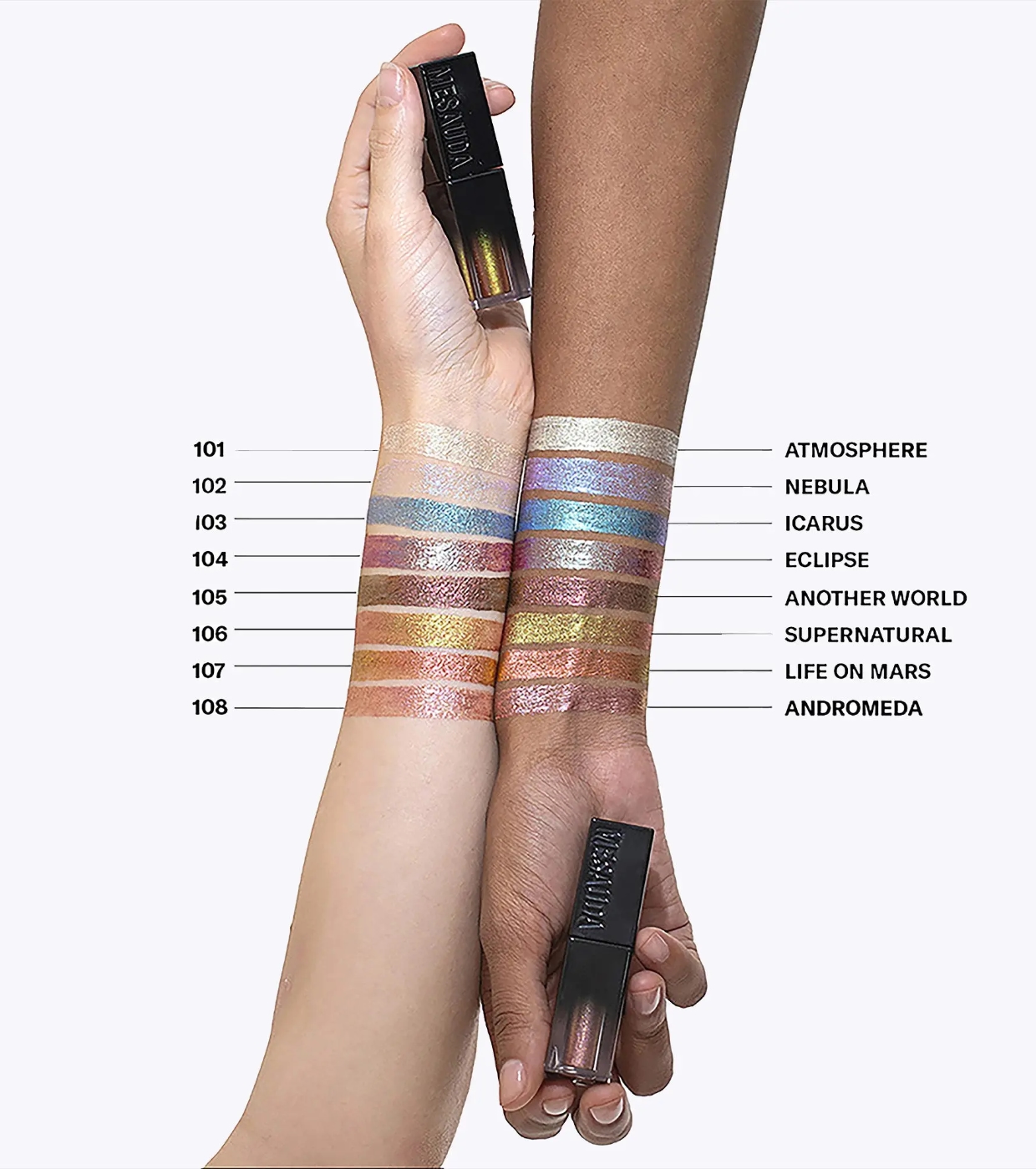 Descubre las sombras de ojos líquidas Galactic Shadow de Mesauda con un espectacular acabado metalizado y una fórmula innovadora a base de agua, que ofrece una experiencia única en cada aplicación.