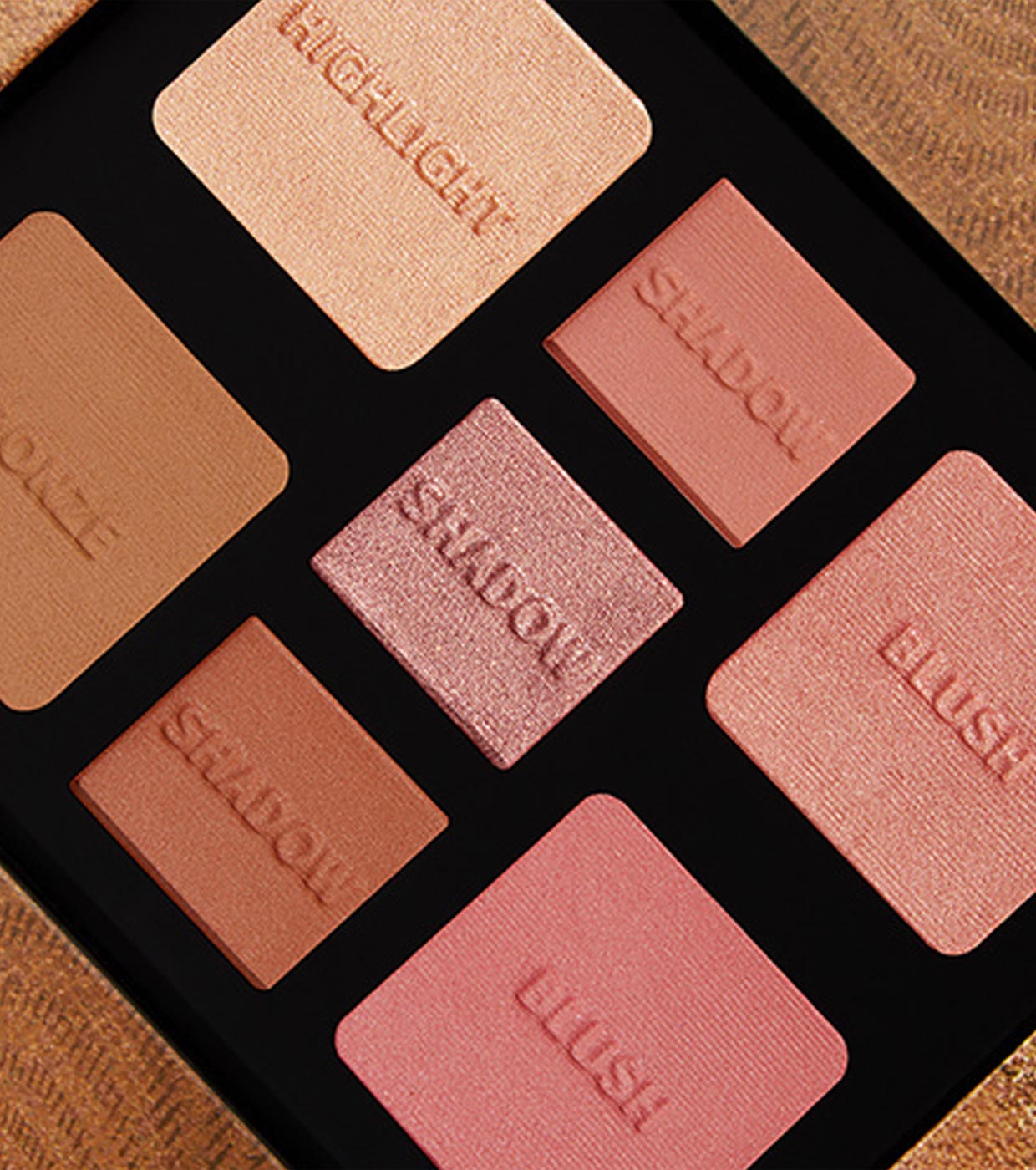 Sombras, coloretes, iluminador y bronceador en polvo, modulables y que se difuminan y aplican con facilidad.