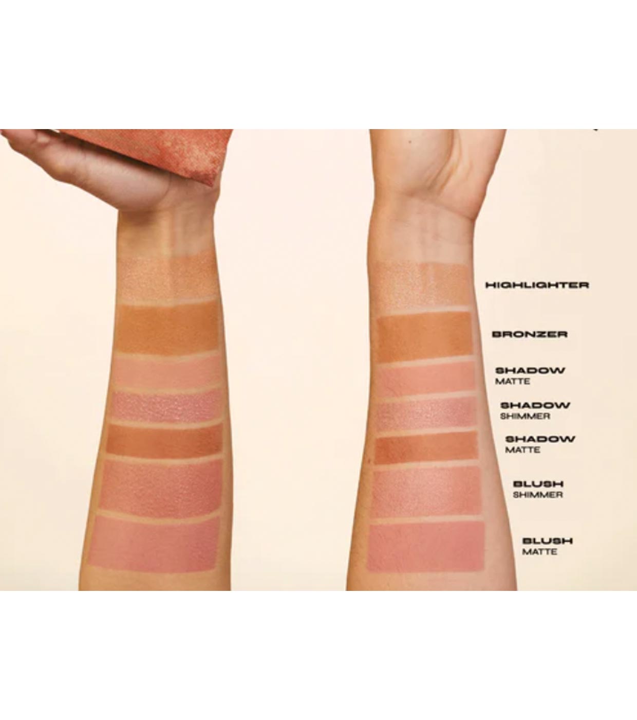 Highlighter: Mica, Octyldodecyl Stearoyl Stearate, Bis-Diglyceryl Polyacyladipate-2, Dimethicone, Pentaerythrityl Tetraisostearate, Synthetic Fluorphlogopite, Phenoxyethanol, Silica, Ethylhexylglycerin, Tocopherol, Tin Oxide, Titanium Dioxide (CI 77891), Iron Oxides (CI 77491, CI 77492, CI 77499).