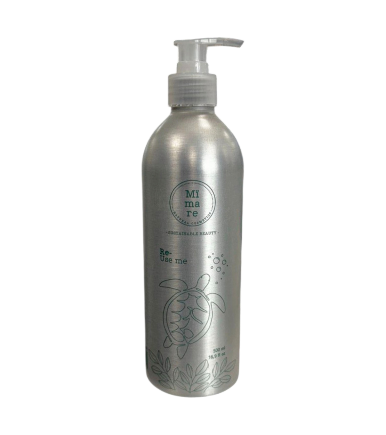 La botella de aluminio reutilizable de Mimare ha sido diseñada para recargar tu champú favorito de forma práctica, higiénica y respetuosa con el medio ambiente.