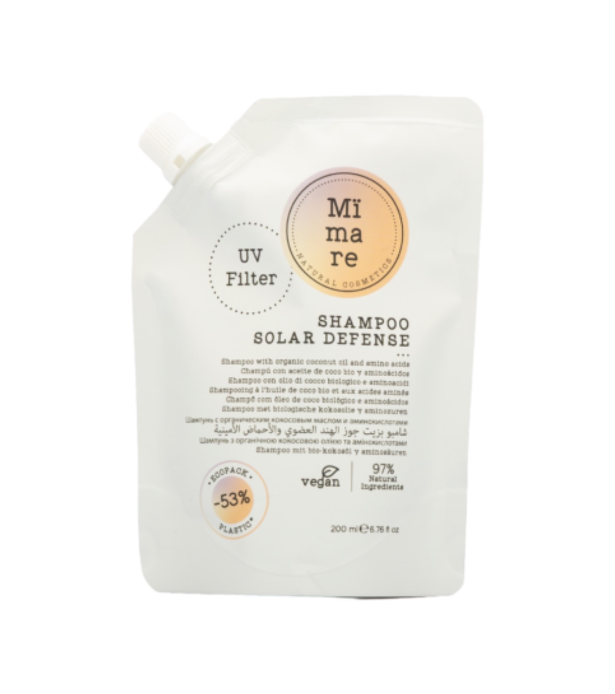 El champú solar Solar Defense de Mimare está especialmente formulado para limpiar el cabello después de la exposición al sol, eliminando eficazmente residuos de cloro, sal y arena.
