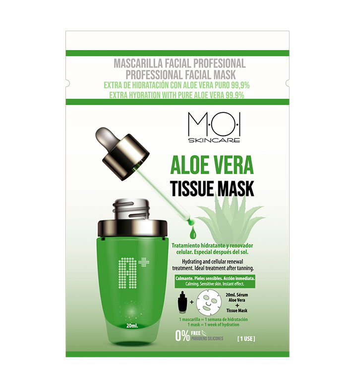 Sobre monodosis que contiene una máscara de microfibra (0.2mm. de grosor) impregnada con un sérum enriquecido con aloe vera que se adapta perfectamente a la piel.