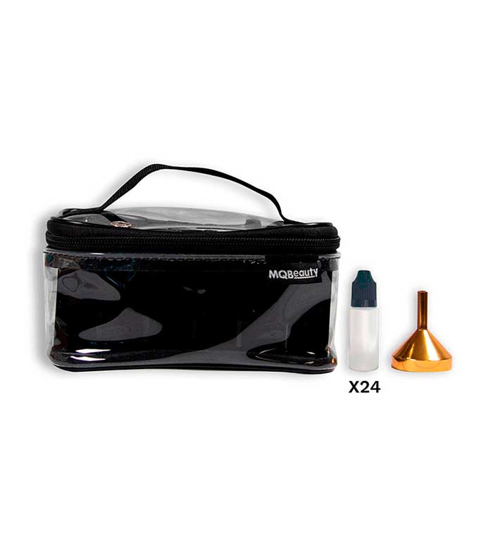 Neceser transparente + botellas de MQBeauty en el que podrás almacenar y transportar tus productos de maquillaje, gracias a su diseño transparente podrás ver todo lo que llevas en su interior de una forma fácil.