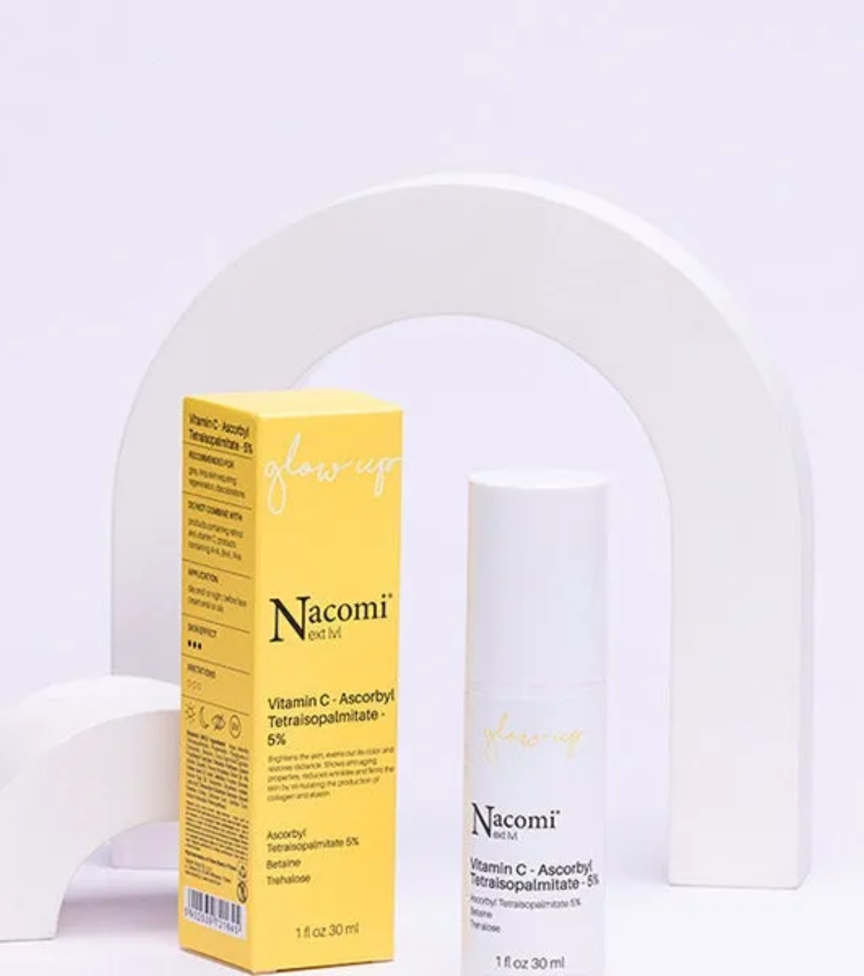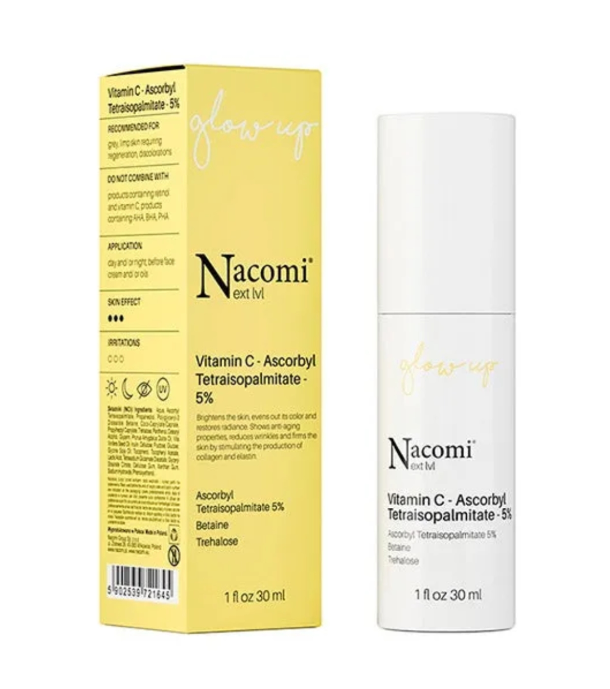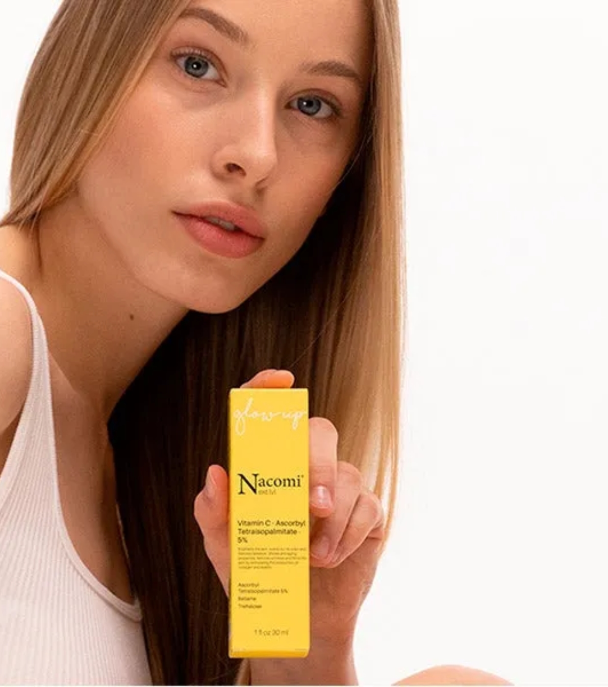 Descubre este sérum con vitamina C Ascorbyl Tetraisopalmitate 5% Glow Up de Nacomi en forma de ascorbil tetraisopalmitato al 5% potencia la luminosidad de la piel, devolviendo su brillo y previniendo los signos visibles del envejecimiento.