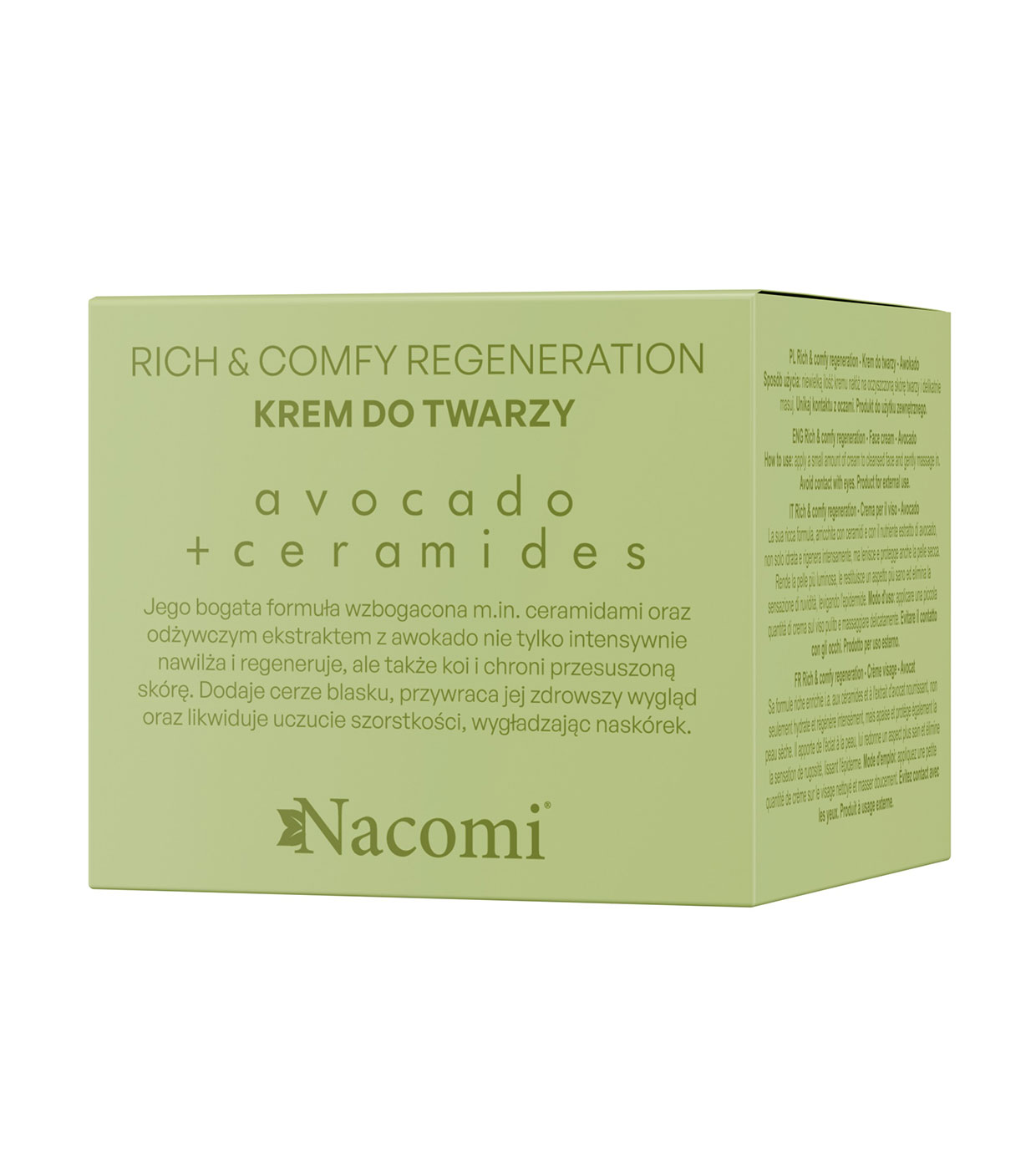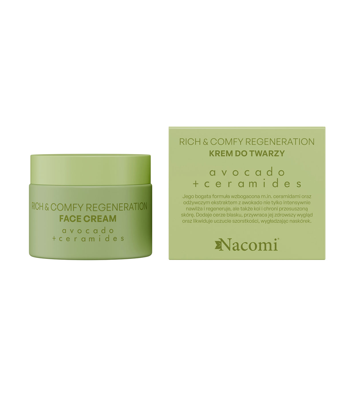 Sumérgete en la experiencia de cuidado lujoso con la crema facial regeneradora Nacomi Rich&Comfy Avocado + Ceramidas.