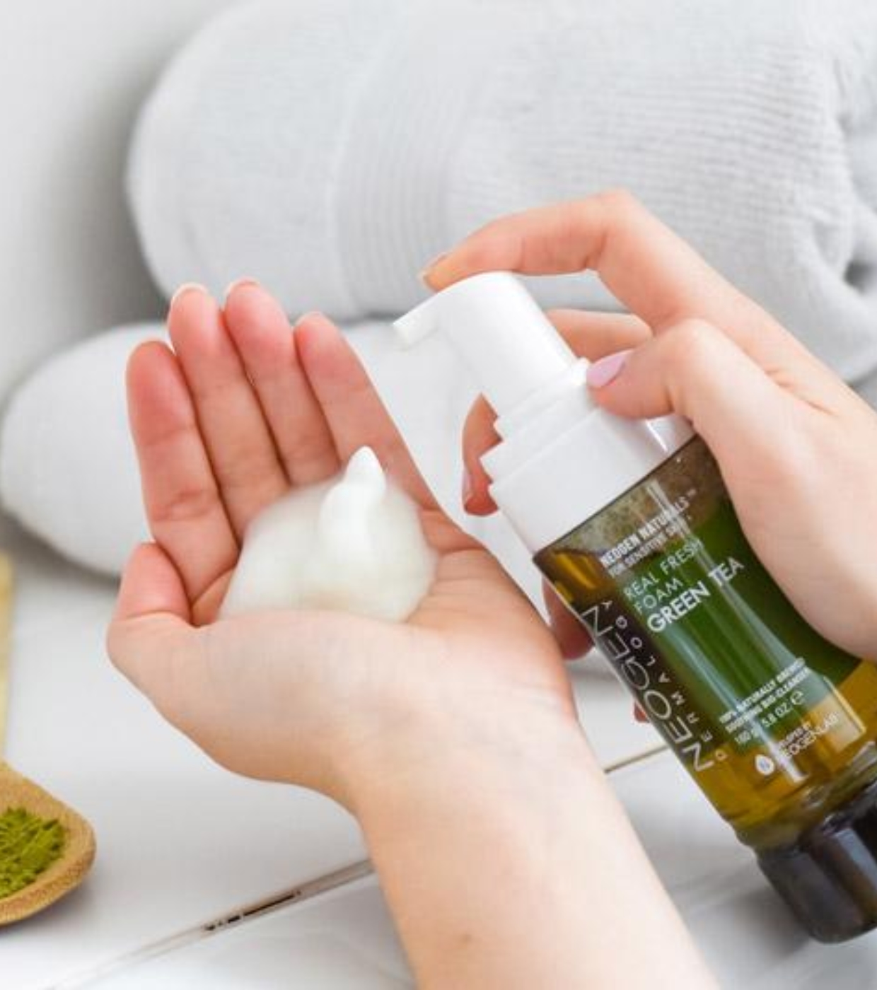 Su fórmula contiene un 62 % de agua de hoja de té verde y 1,1 % de hojas reales de té verde orgánico, que aportan una acción calmante, antioxidante y purificante durante la limpieza.