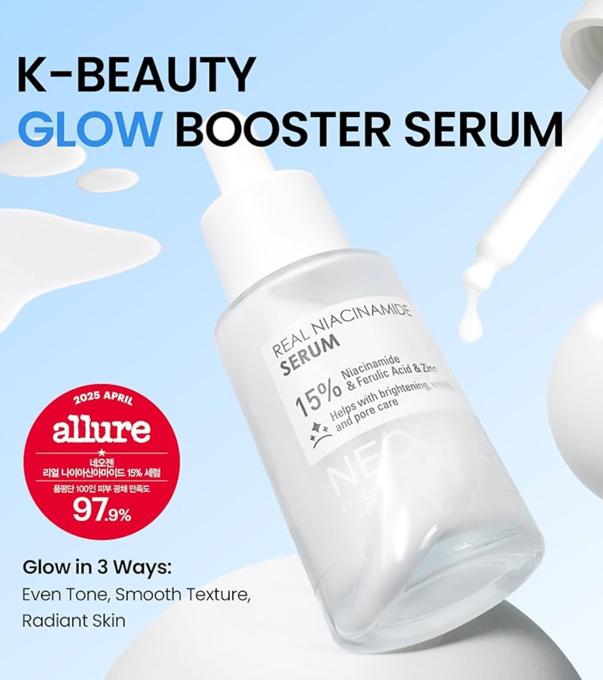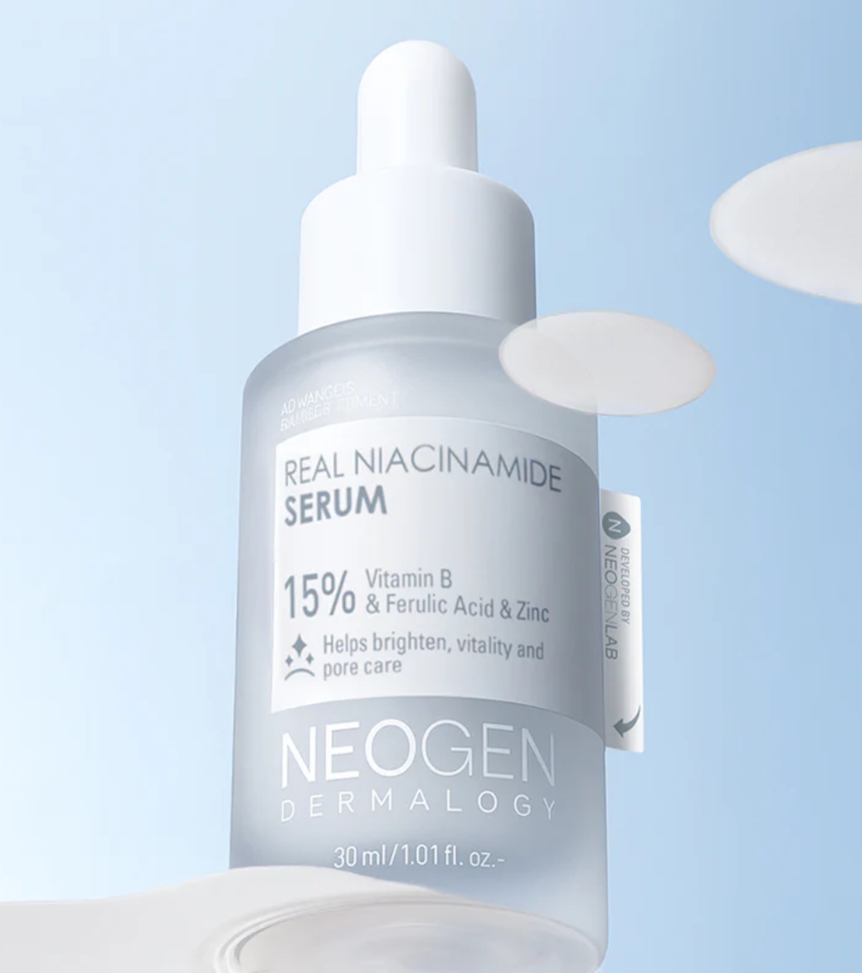 La fórmula contiene un 15% de niacinamida pura, que ayuda a reducir manchas, prevenir su reaparición y mejorar la luminosidad general de la piel.