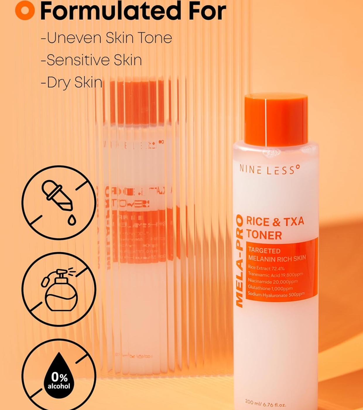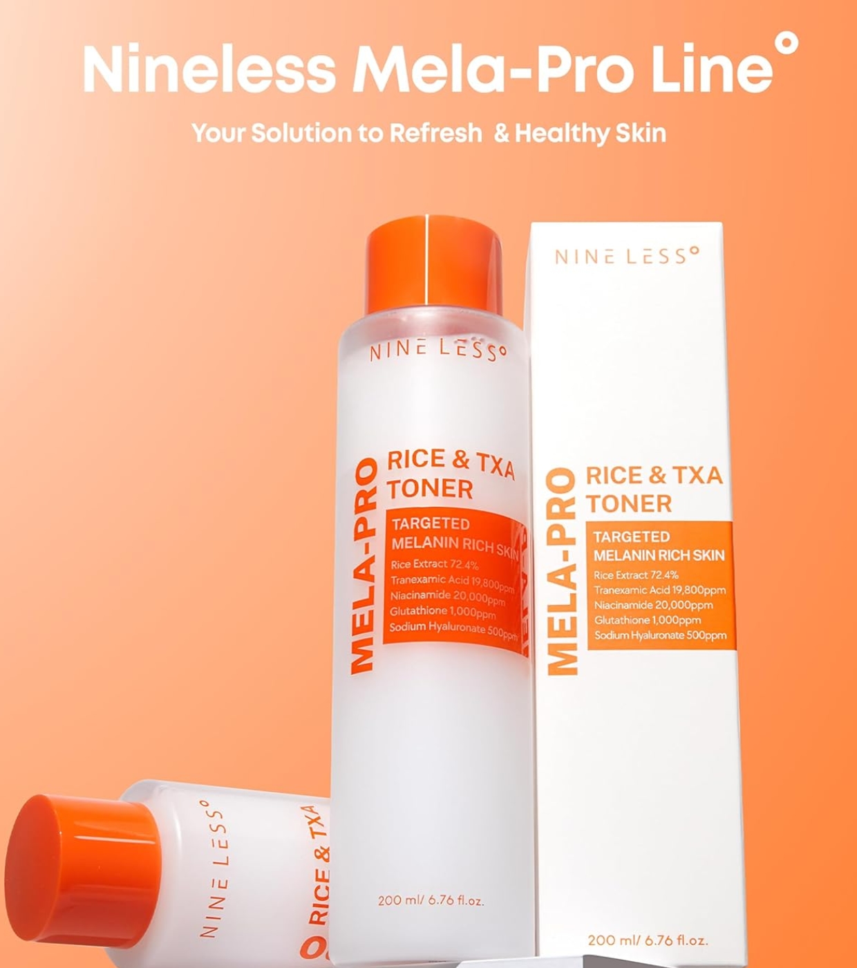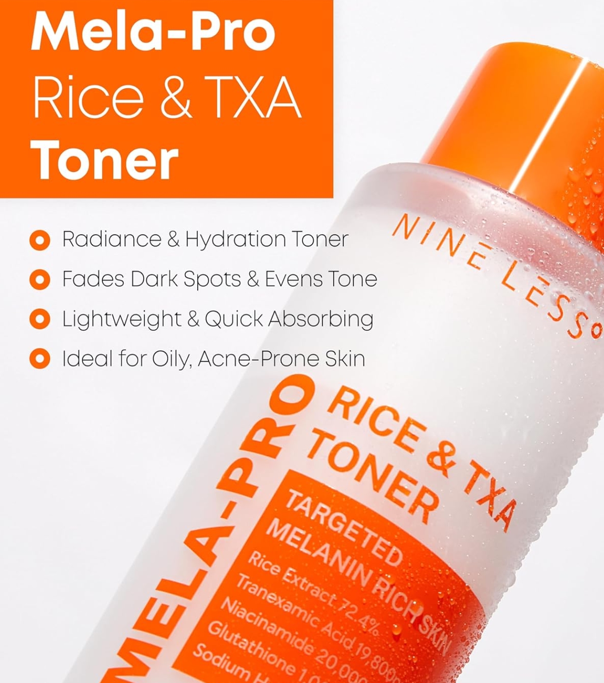 El tónico facial de arroz y TXA MELA-PRO de Nineless está diseñado para tratar eficazmente las manchas oscuras, la hiperpigmentación y el tono desigual de la piel.