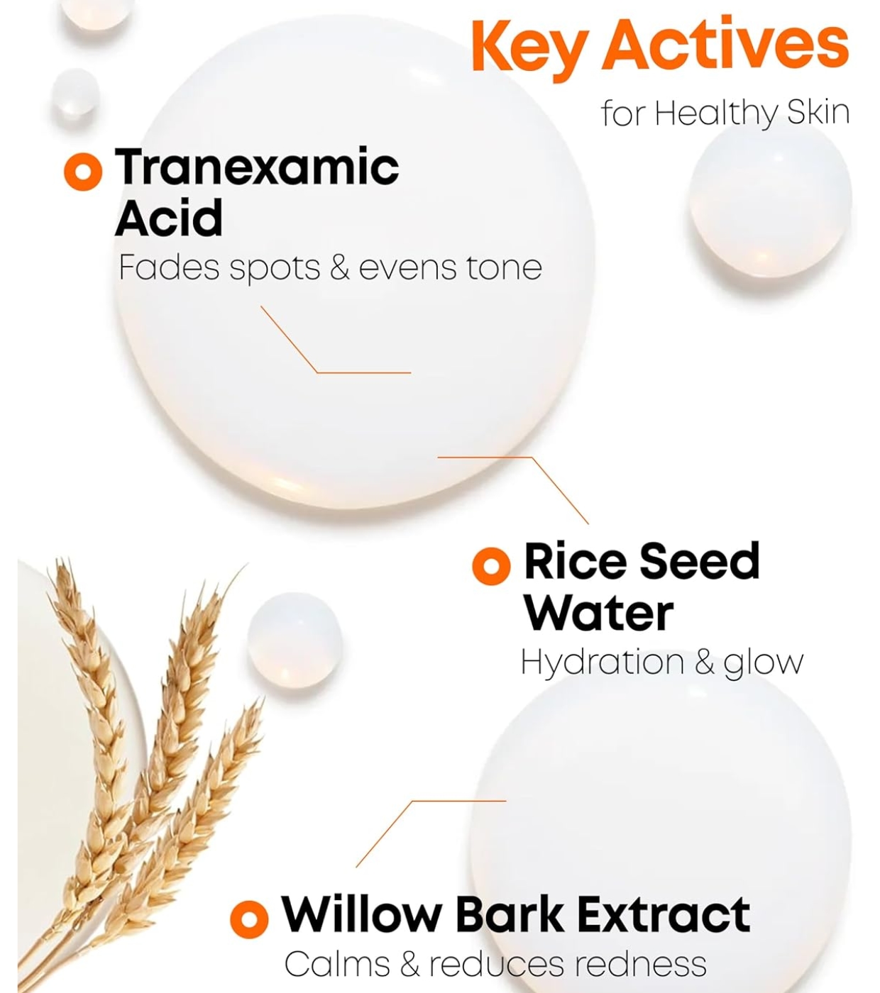 Oryza Sativa (Rice) Seed Water, Cetylethylhexanoate, Methylpropanediol, Niacinamide, Tranexamic Acid, 1,2-Hexanediol, Dipropylene Glycol, Hydroxyacetophenone, Water, Caprylyl Glycol, Glutathione, C12-13 PARETH-9, Styrene/Acrylates Copolymer, Butylene Glycol, Octyldodecanol, Sodium Hyaluronate, Coco-Glucoside, Macadamia Ternifolia Seed Oil, Caprylic/Capric Triglyceride, Squalane, Olea Europaea (Olive) Fruit Oil, Disodium EDTA, Sodium Chloride, Hydrogenated Lecithin, Lysolecithin, Benzoic Acid, Citric Acid, Dipotassium Glycyrrhizate, Salix Alba (Willow) Bark Extract, Origanum Vulgare Leaf Extract, Chamaecyparis Obtusa Leaf Extract, Lactobacillus/Soybean Ferment Extract, Cinnamomum Cassia Bark Extract, Scutellaria Baicalensis Root Extract, Portulaca Oleracea Extract