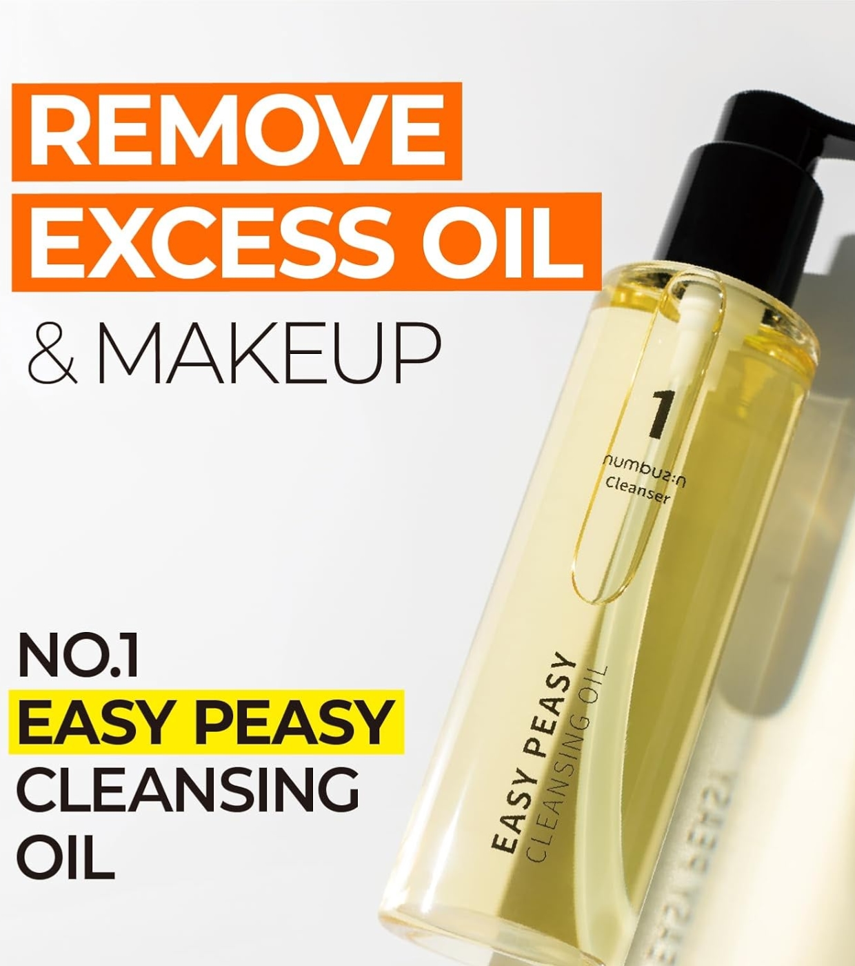 Descubre el aceite limpiador Easy Peasy no.1 de Numbuzin que transforma tu rutina de limpieza, eliminando suavemente el maquillaje resistente al agua, puntos negros y exceso de sebo, dejando tu piel fresca y equilibrada.