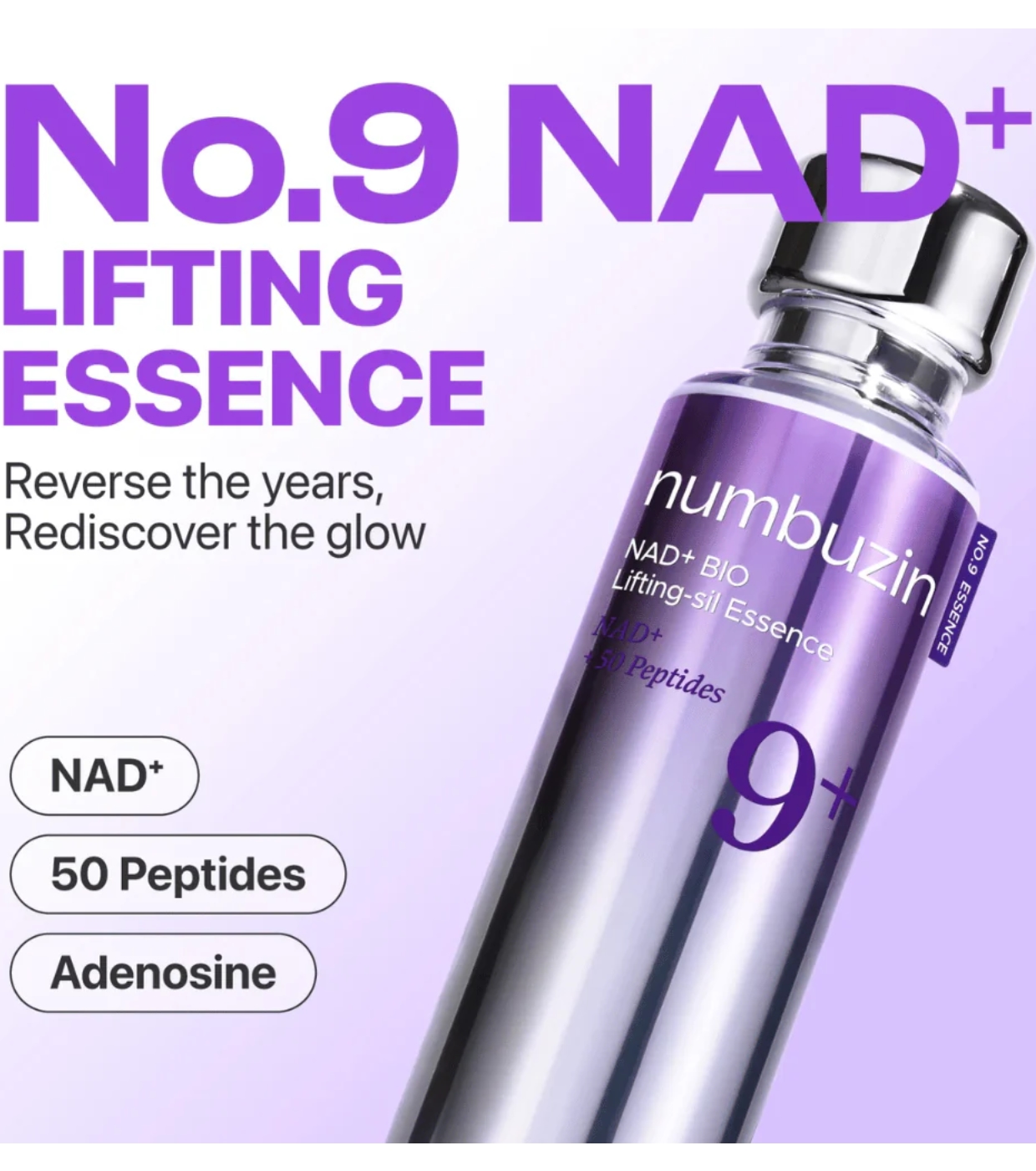 Numbuzin No.9 NAD Bio Lifting-sil Essence es una esencia antienvejecimiento poderosa que combina ciencia y naturaleza para restaurar la firmeza, elasticidad y luminosidad de la piel.