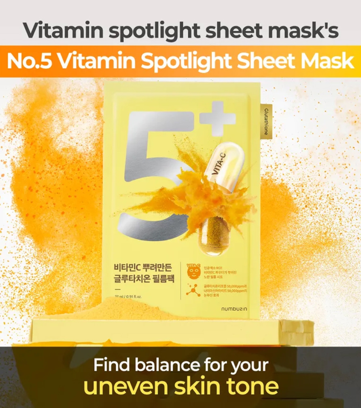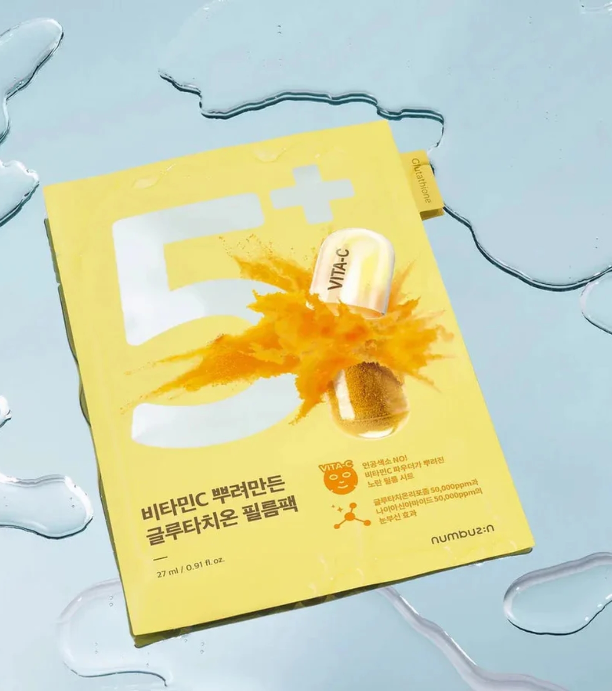 Devuelve la luminosidad a tu piel con esta mascarilla facial iluminadora No.5+ Glutathione Vitamin Concentrated de Numbuzin tipo ampoule, formulada con glutatión liposomal, niacinamida y vitamina C para tratar el tono apagado y las manchas.