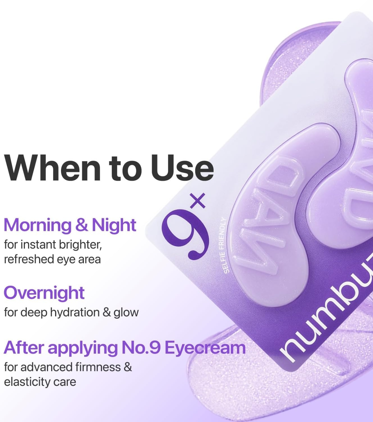 Restaura la energía, firmeza y luminosidad del contorno de ojos con los NAD+ No. 9 Under Eye Collagen Patches de Numbuzin, unos parches de hidrogel antiedad de alta eficacia diseñados para tratar de forma intensiva los signos de fatiga y envejecimiento en la delicada zona ocular.