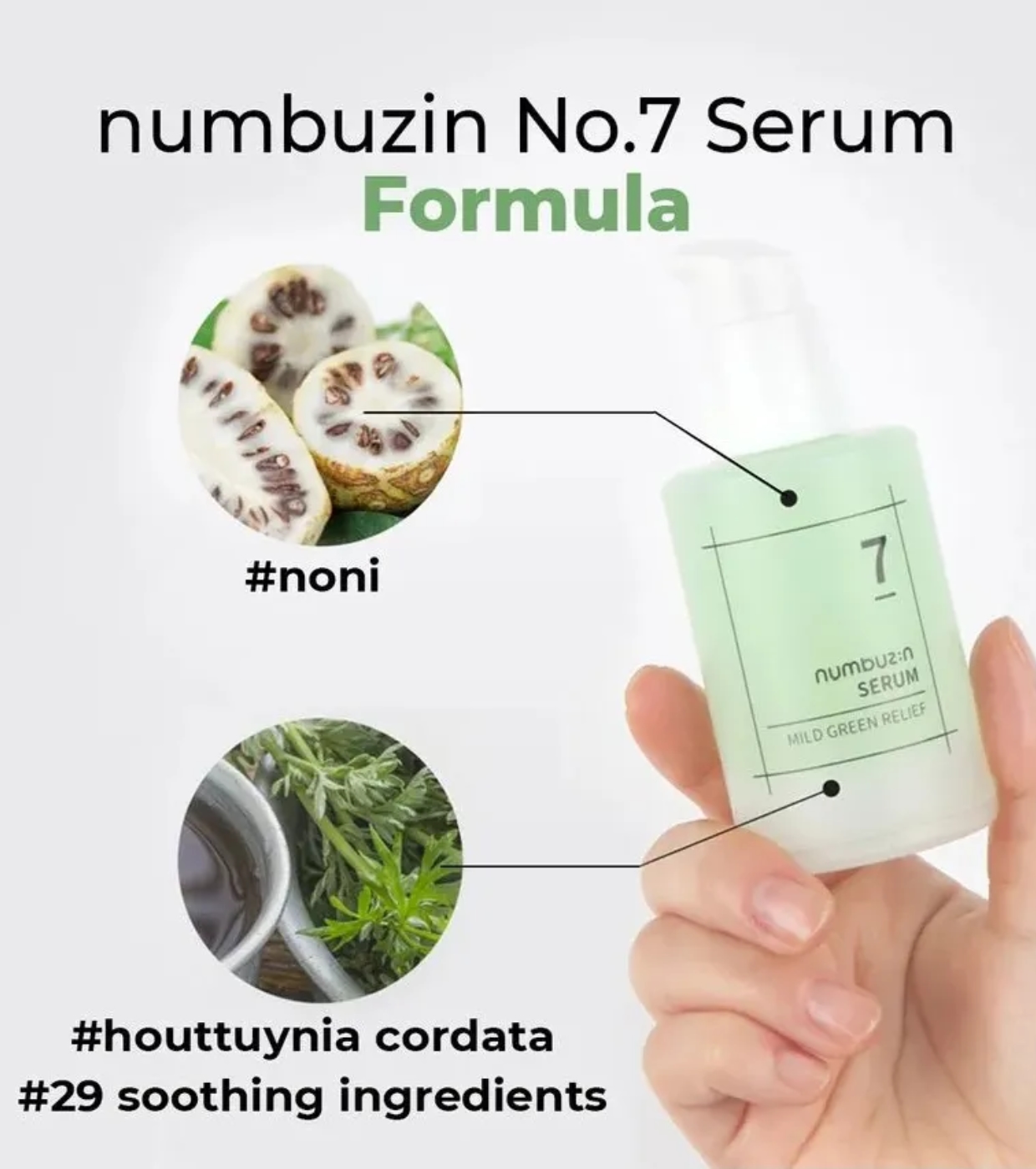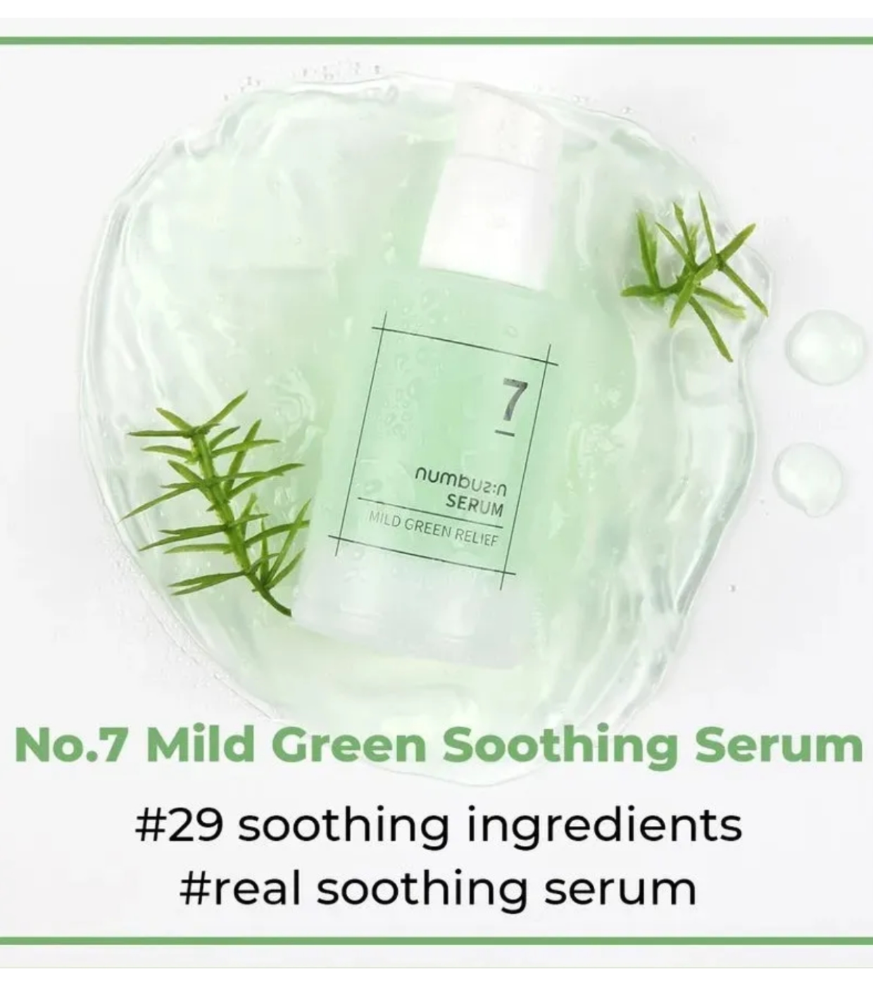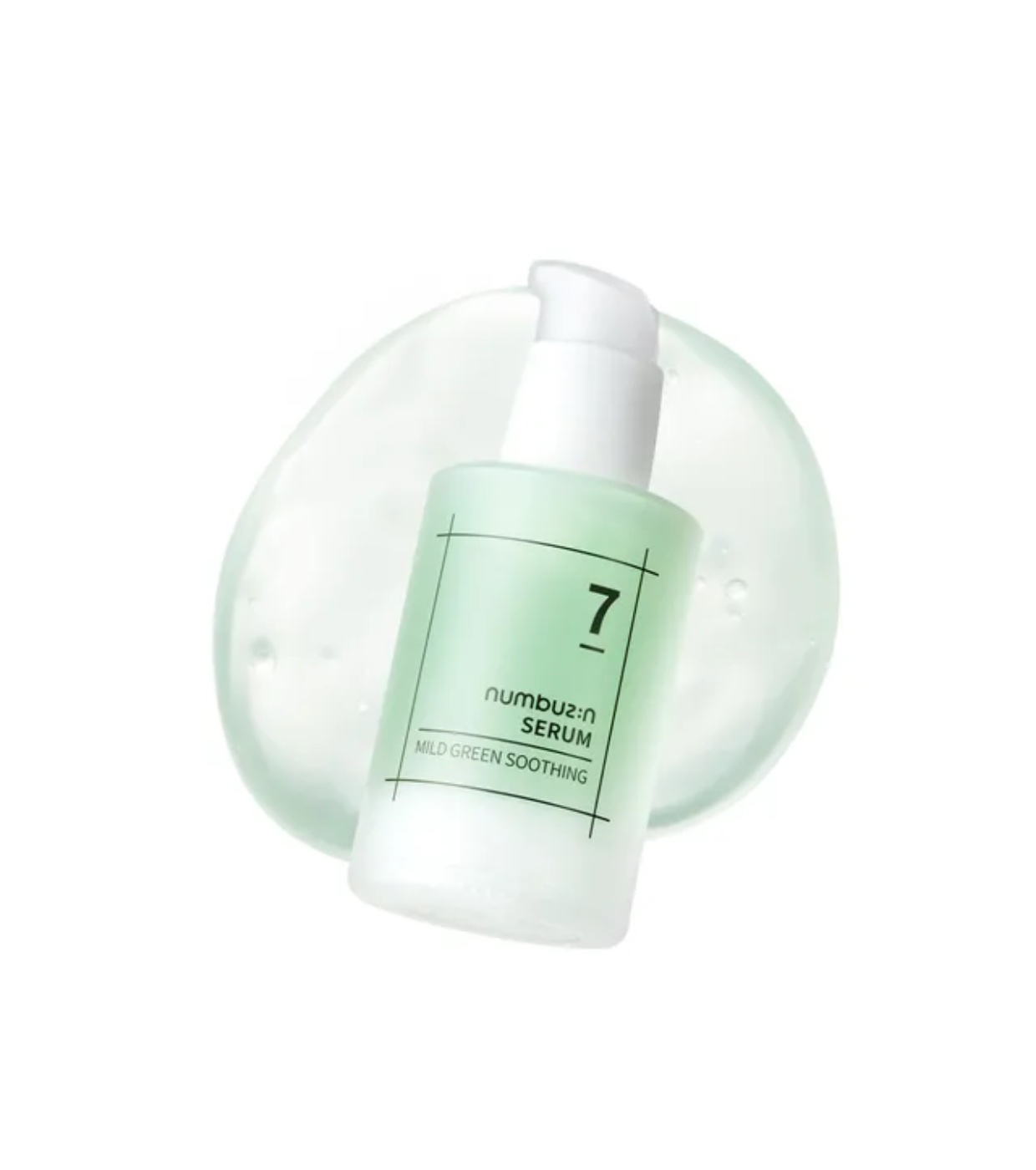 Calma, hidrata y fortalece tu piel con este sérum calmante No.7 Mild Green Soothing de Numbuzin de textura gel acuoso, formulado especialmente para pieles sensibles o irritadas.