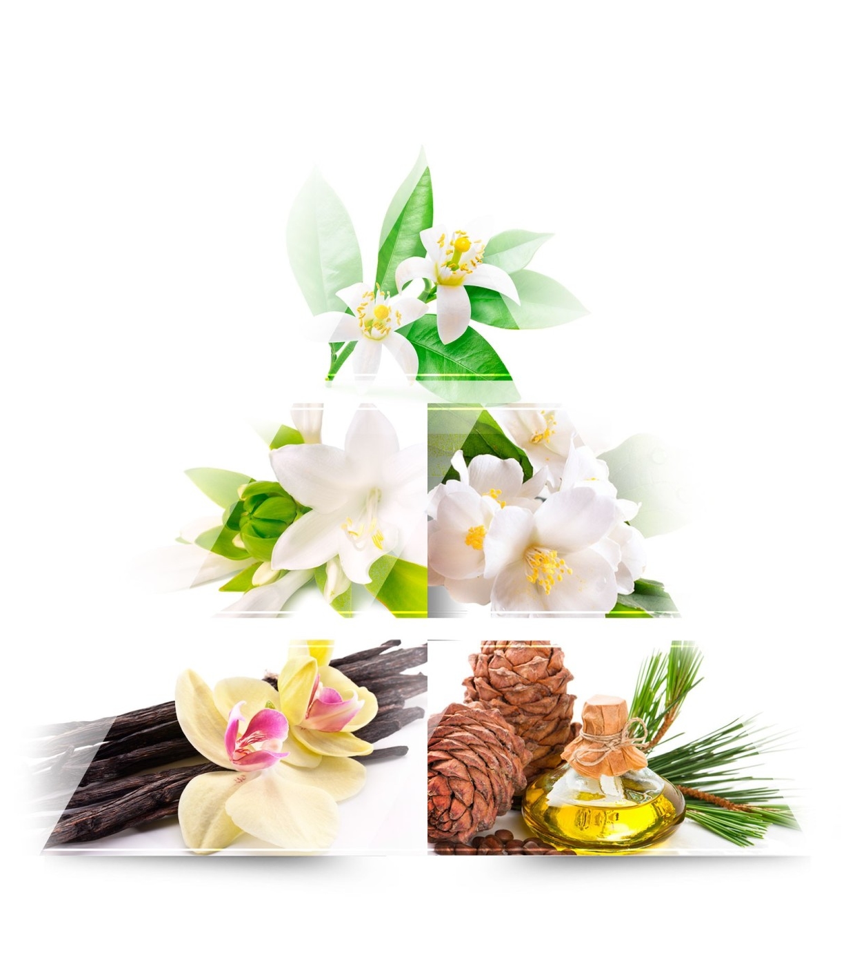 - Notas de fondo: almizcle blanco, vainilla y cedro.