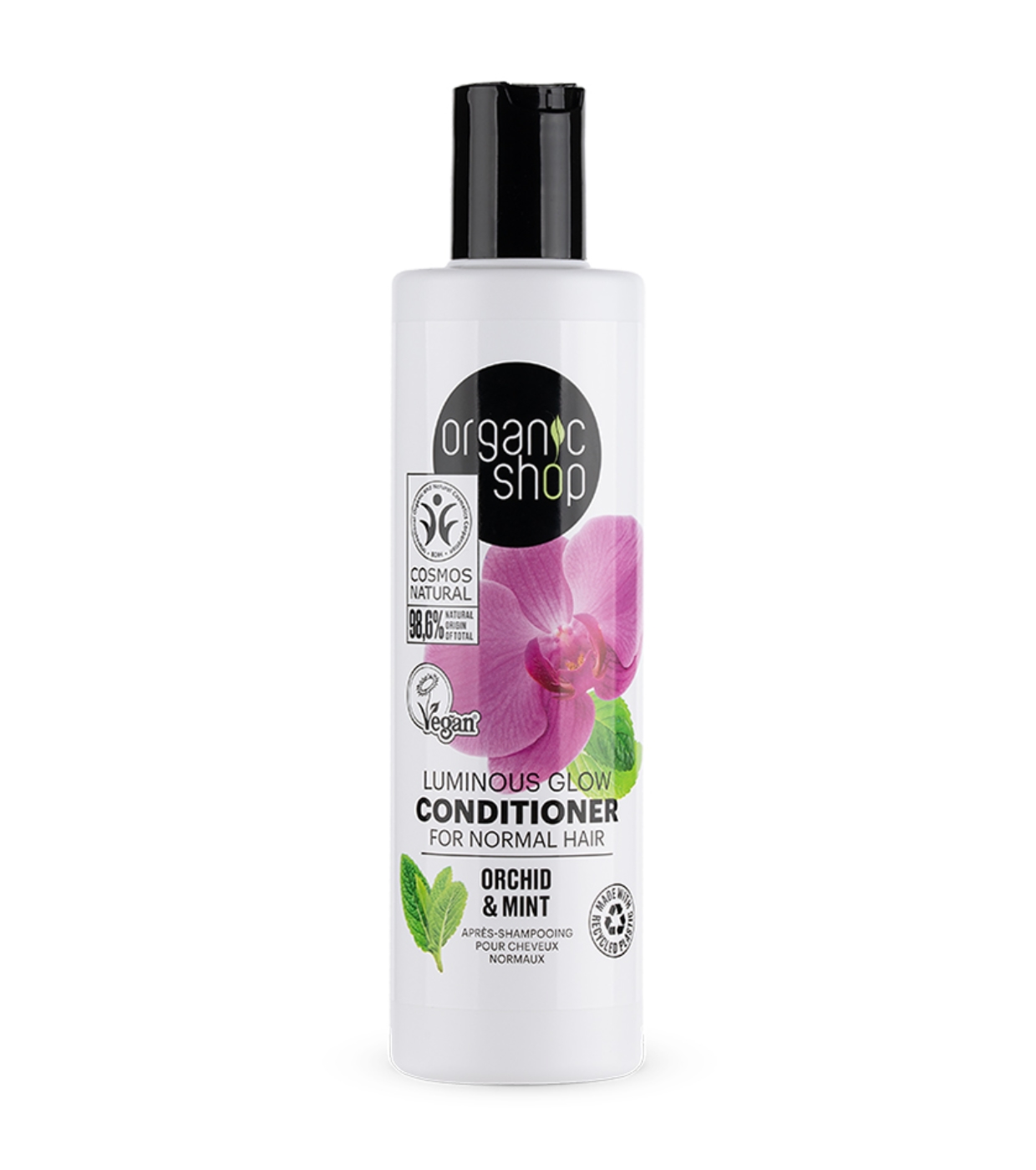 Descubre el poder rejuvenecedor del acondicionador Luminous Glow de Organic Shop, formulado con la delicada esencia de la Orquídea y la refrescante Menta.