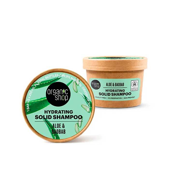 Champú sólido hidratante de Organic Shop con extracto de aloe y baobab.