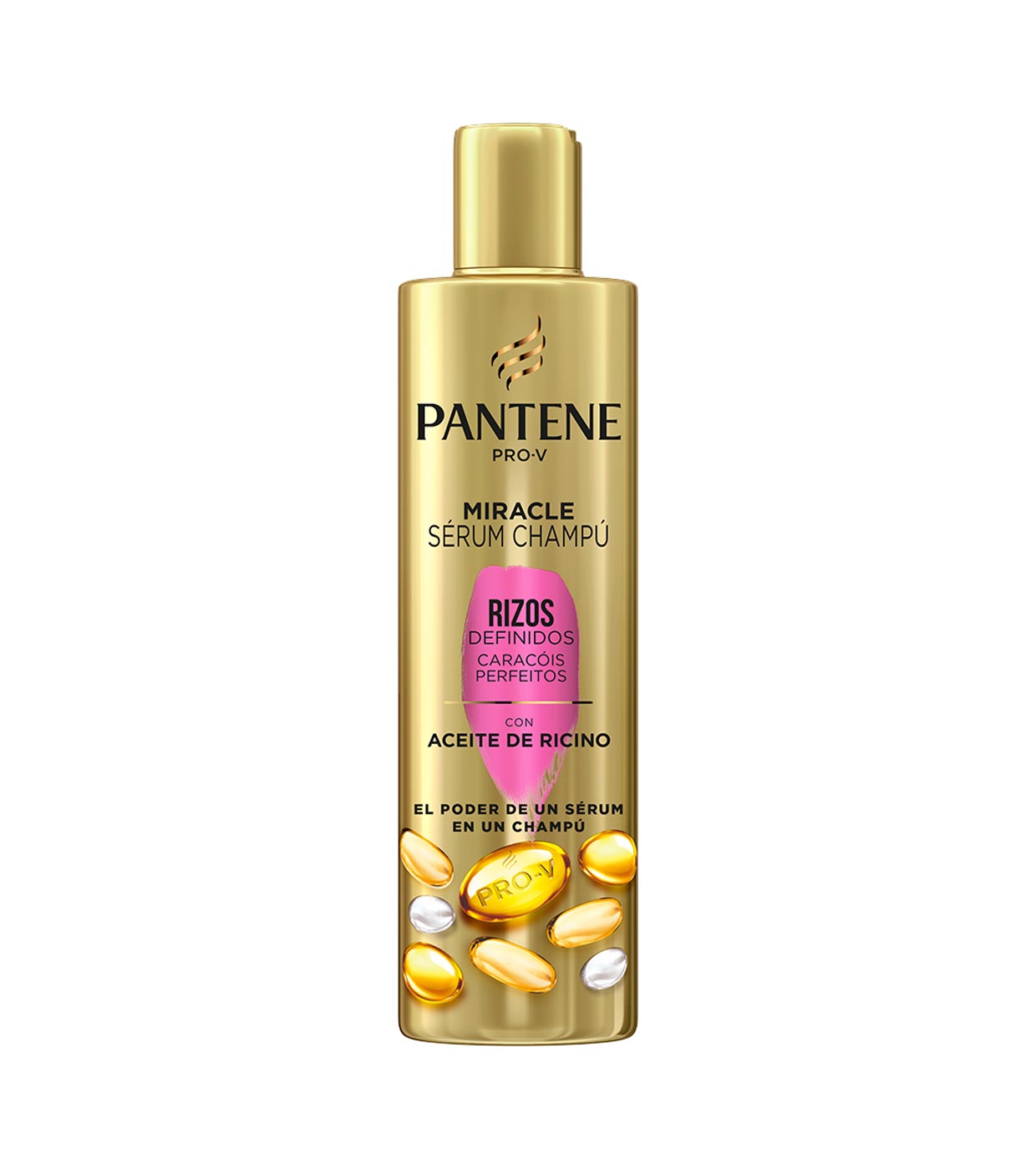El Champú Miracle Serum Pantene Rizos Definidos está enriquecido con nutrientes que hidratan los rizos encrespados y rebeldes hasta la raíz.