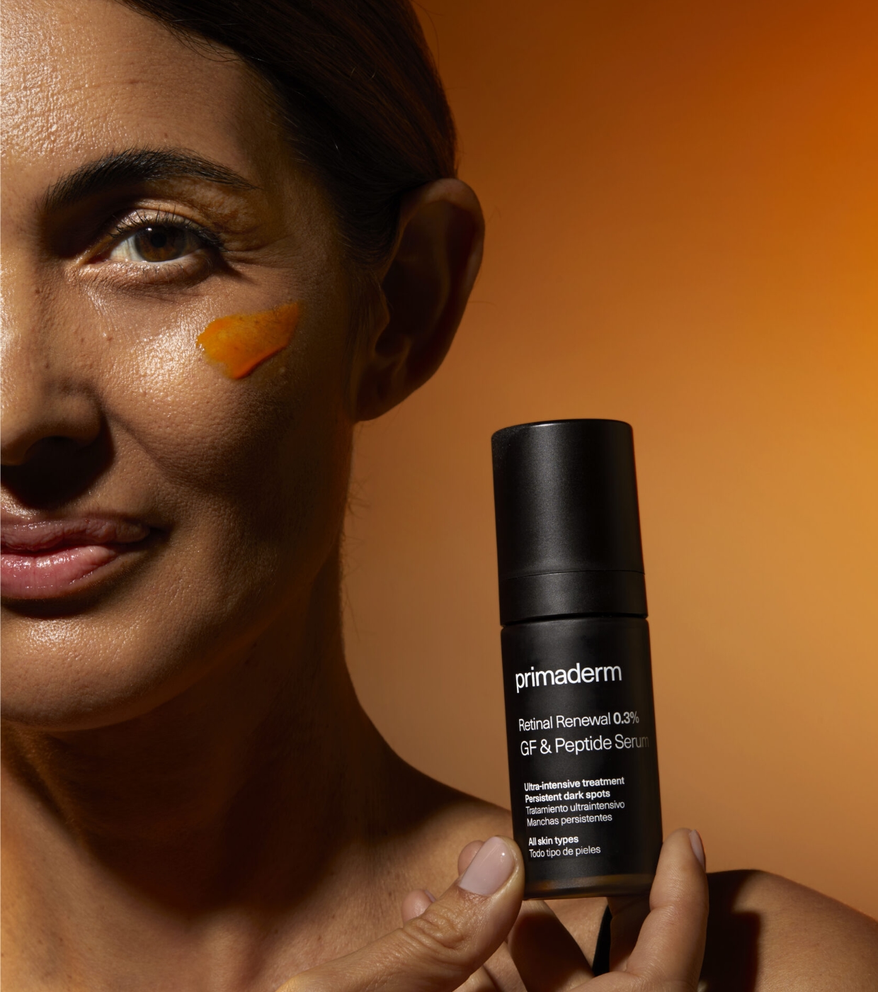 Retinal Renewal 0.3% GF & Peptide Serum de Primaderm modula de forma inteligente los mecanismos de protección, renovación y despigmentación, ofreciendo una estrategia terapéutica integral para rejuvenecer visiblemente la piel.