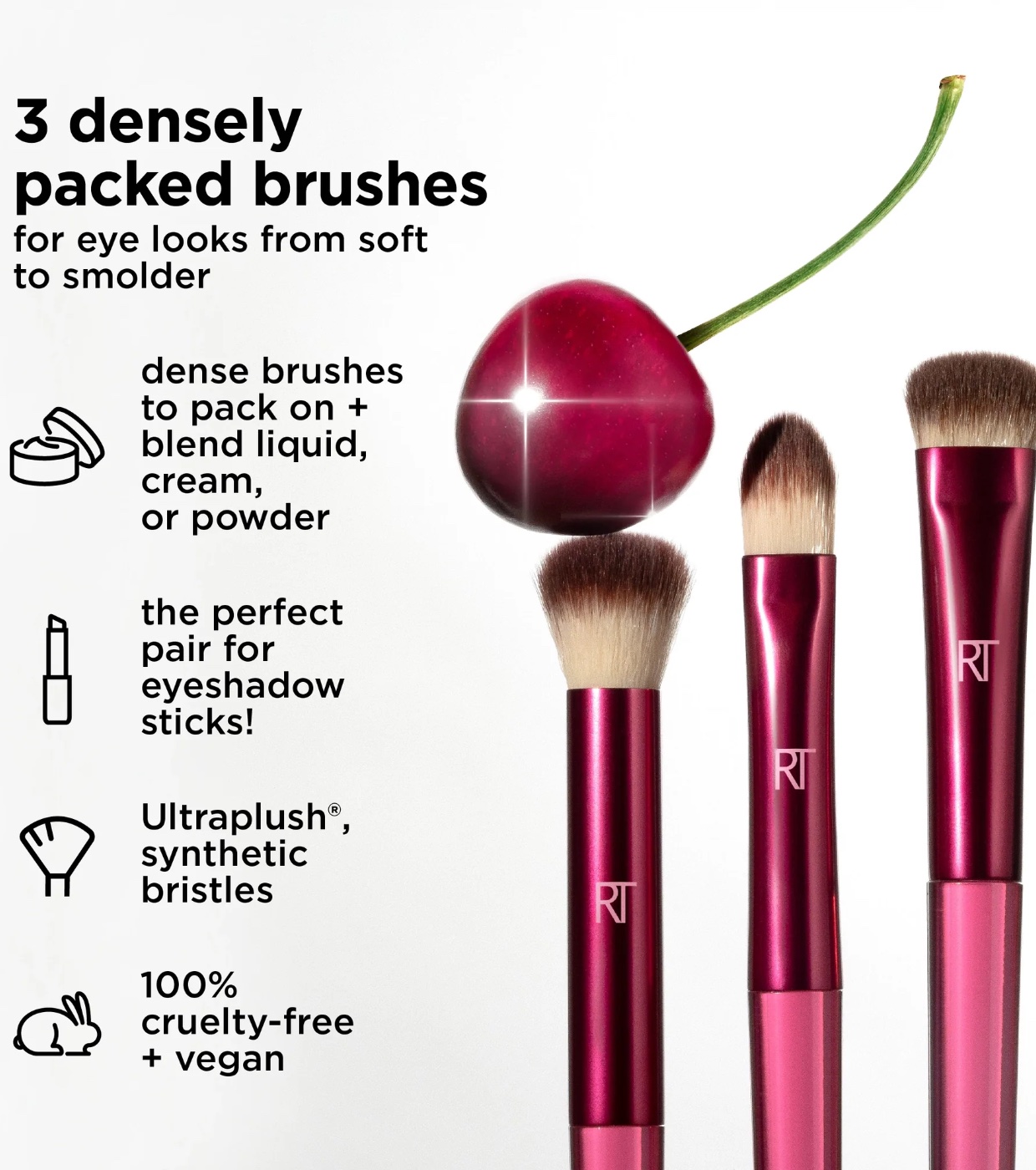 El trío de brochas para ojos MesmerEYES de Real Techniques es una colección de edición limitada que incluye 3 brochas para sombras de ojos que permiten difuminar con precisión cualquier tipo de maquillaje de ojos, desde el más suave al más intenso
