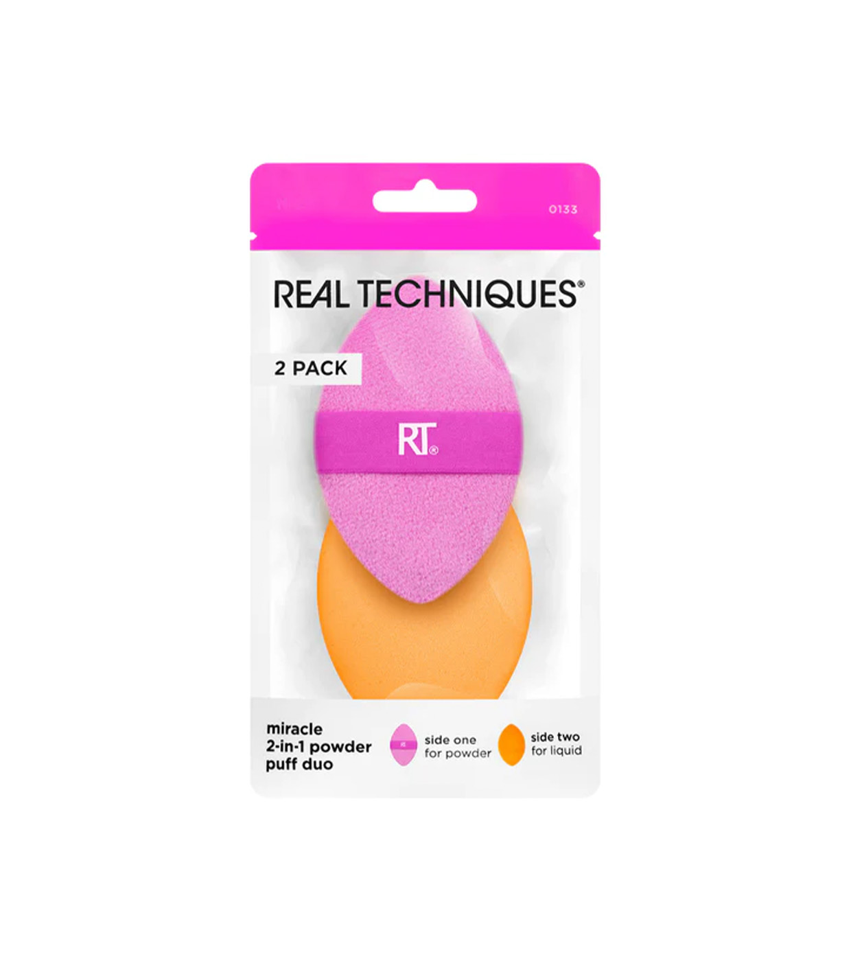 Real Techniques Miracle 2-in-1 Powder Puff es una borla de maquillaje multiusos de doble textura diseñada para trabajar con polvos, líquidos y cremas para una base suave y perfectamente fijada.
