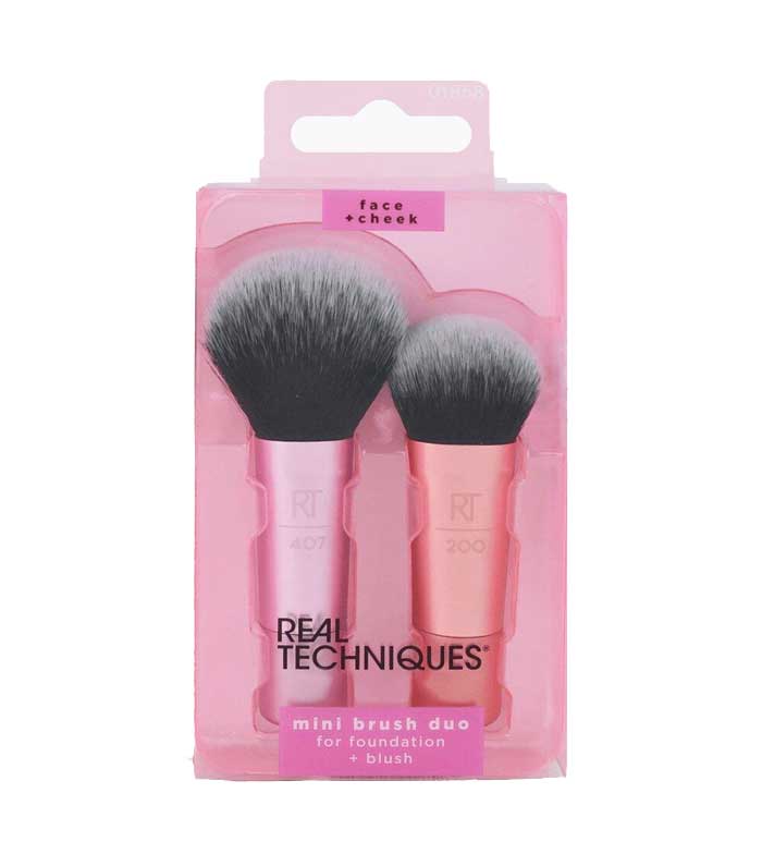 Dúo de brochas mini para base de maquillaje y colorete 407 + 200 de [Real Techniques] ideal para llevar en tus viajes y siempre contigo.