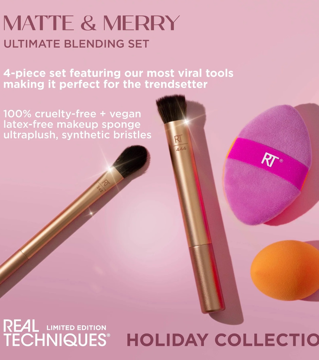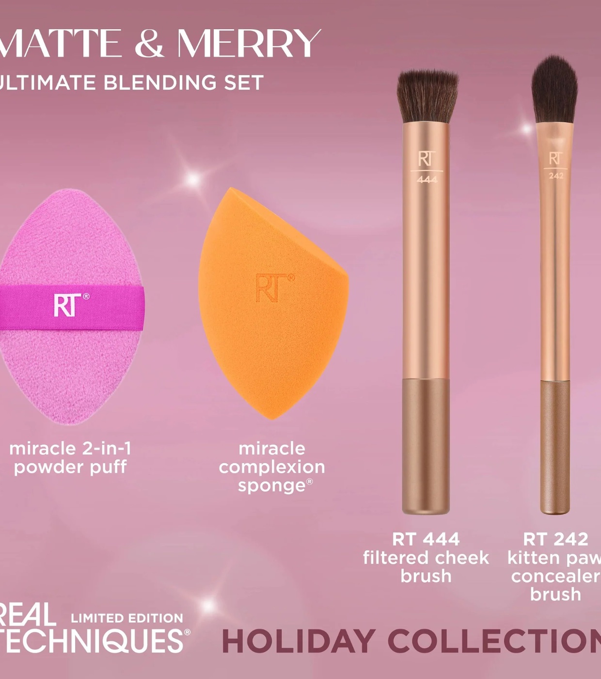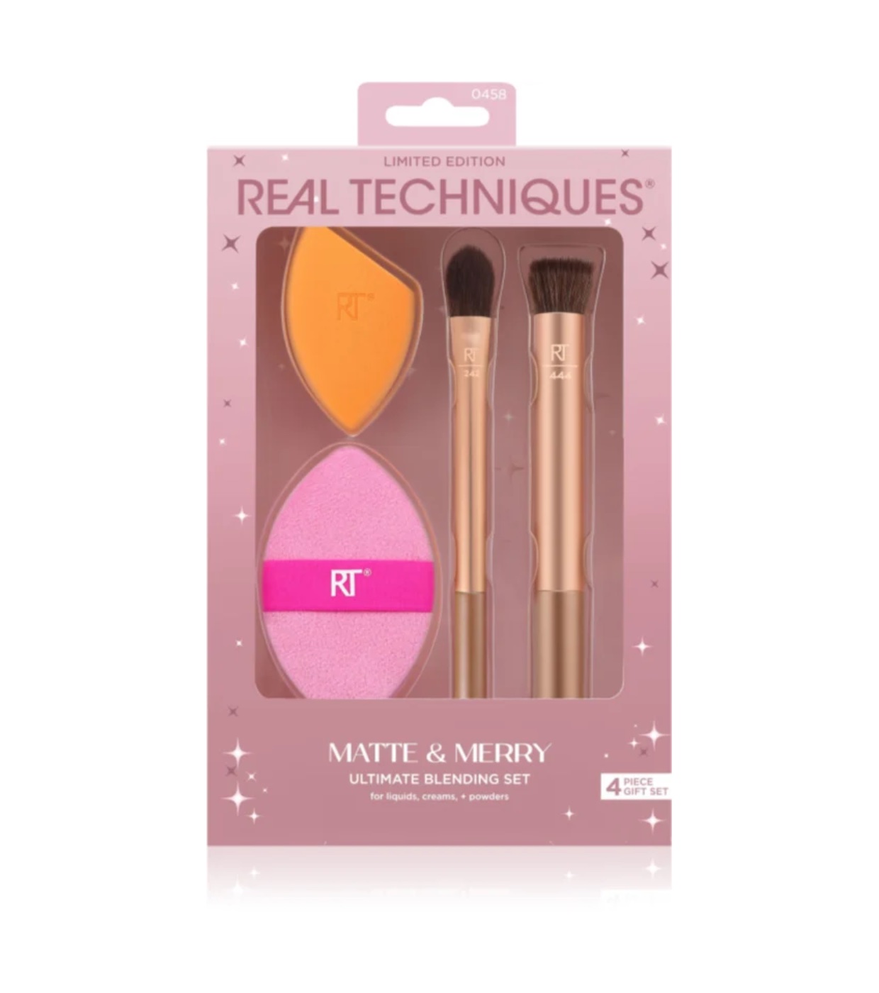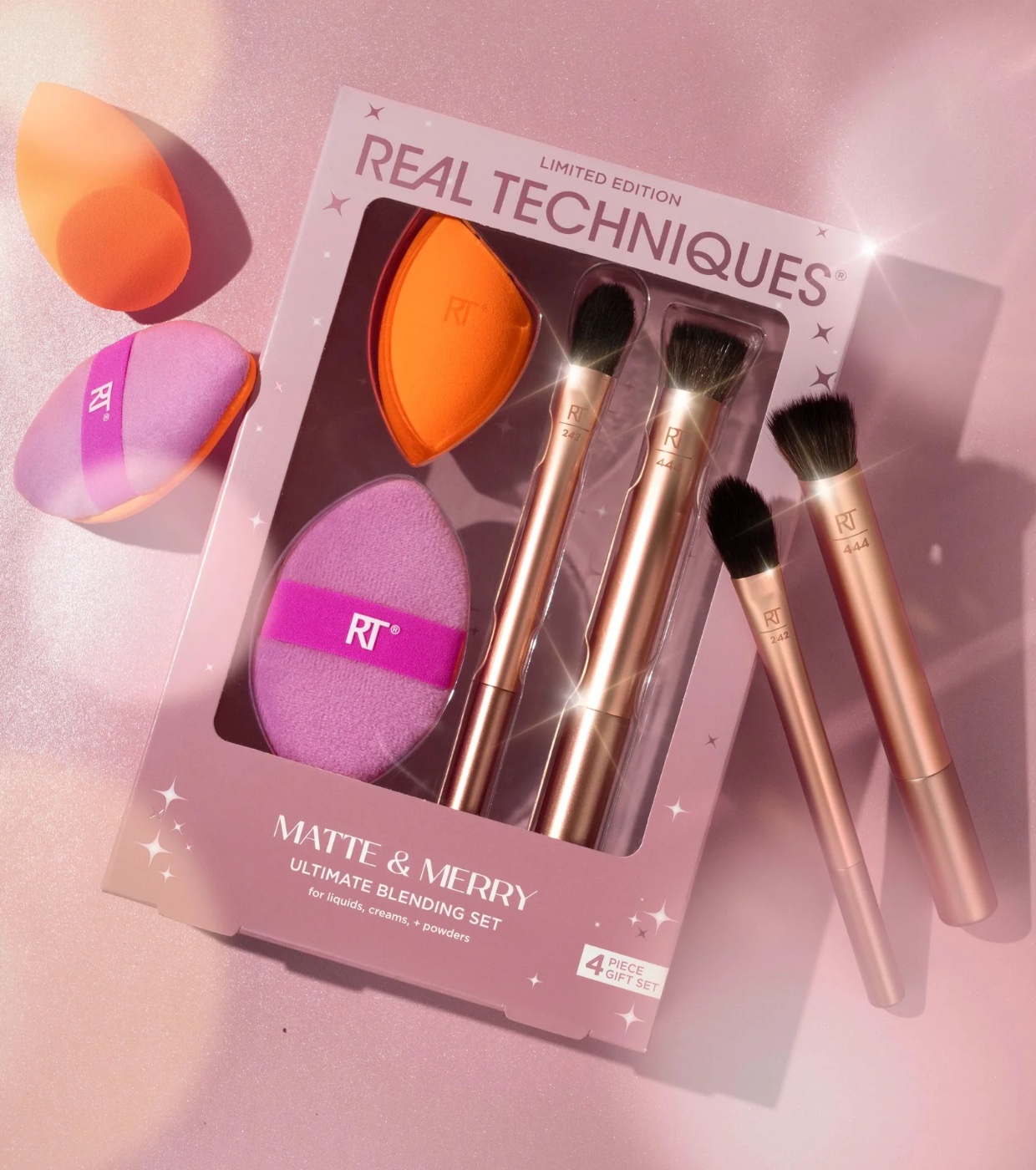 Eleva tu rutina de maquillaje con el Real Techniques Holidays 2024 Set Brochas + Esponjas Matte & Merry, el kit definitivo para conseguir un acabado impecable y profesional desde casa.