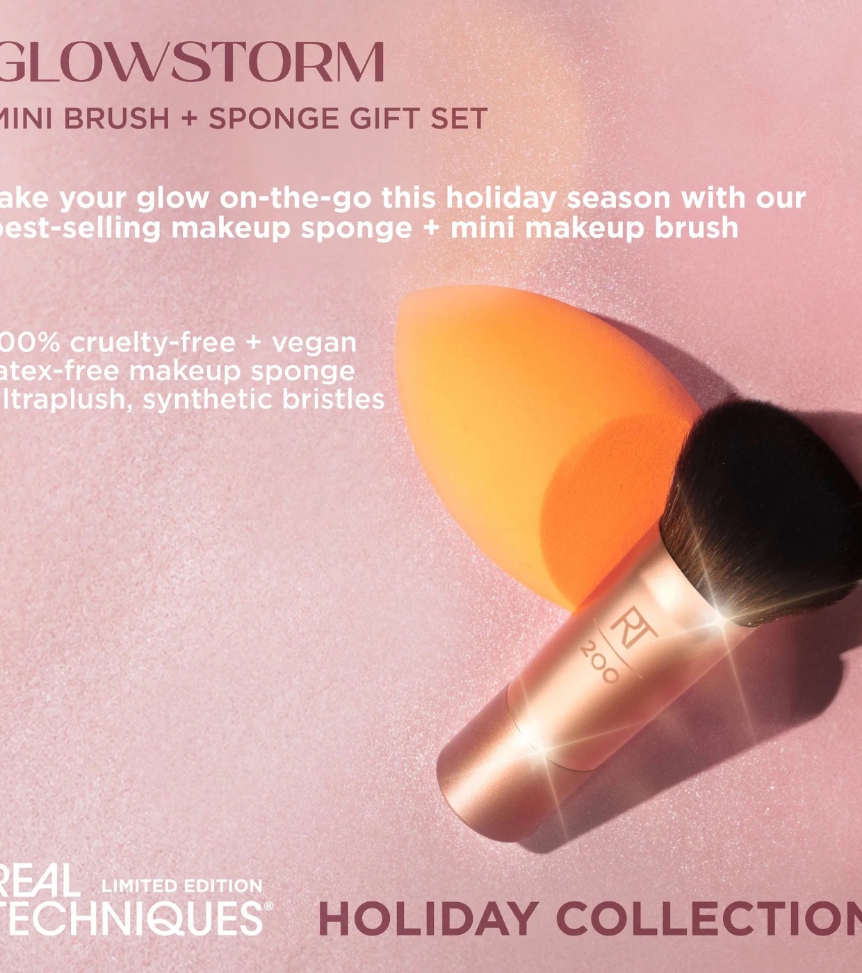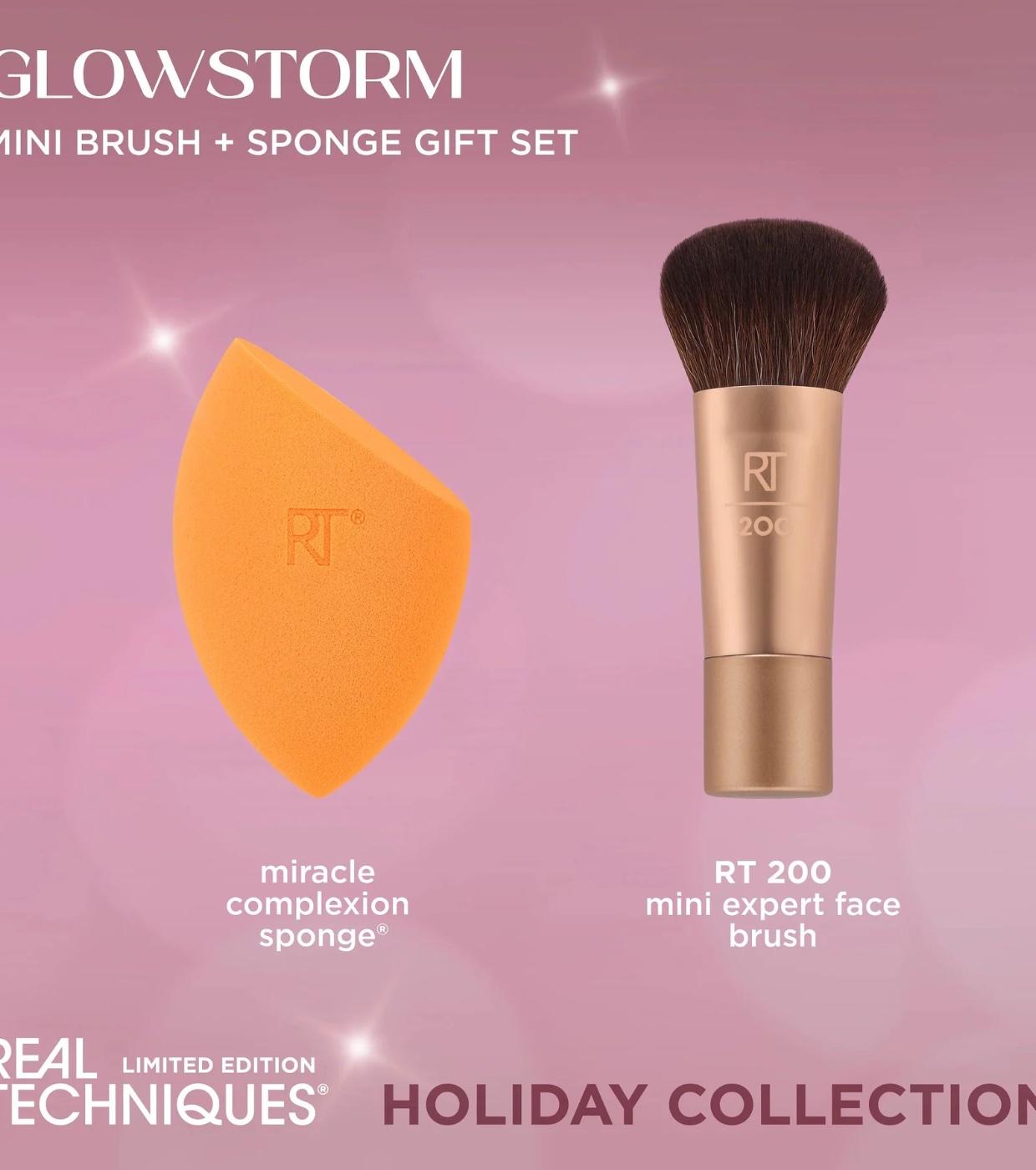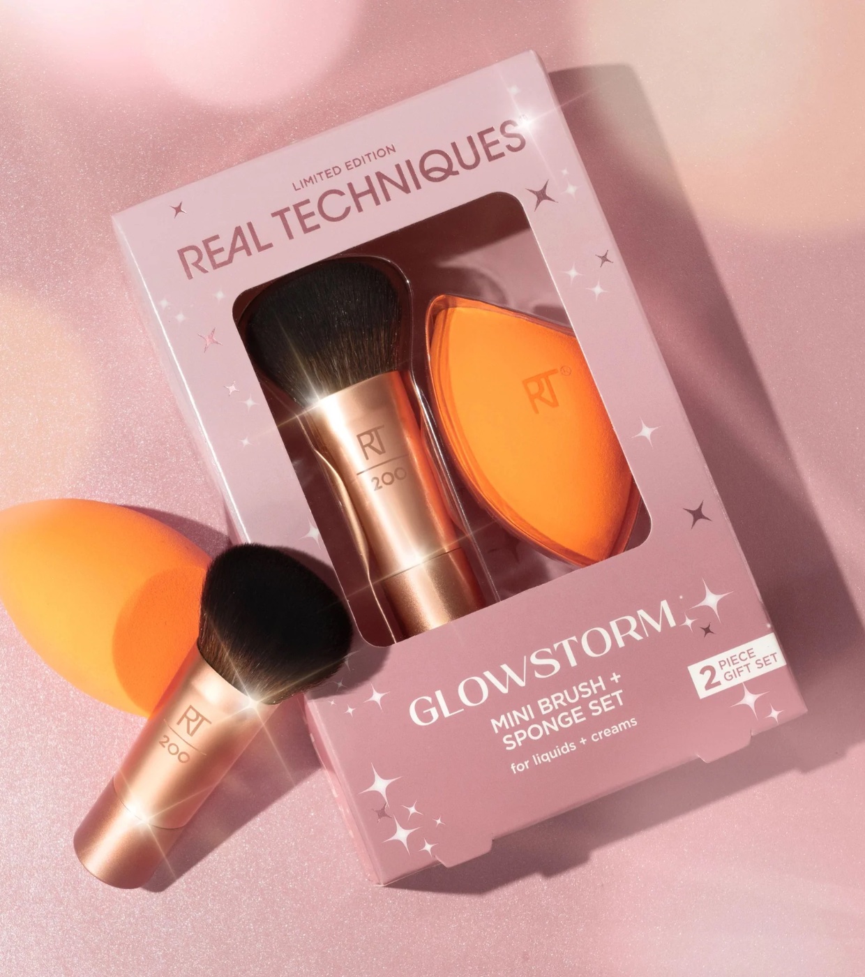 Set mini brocha + esponja Glowstorm Holidays 24 Real Techniques: Edición Limitada para un acabado radiante.