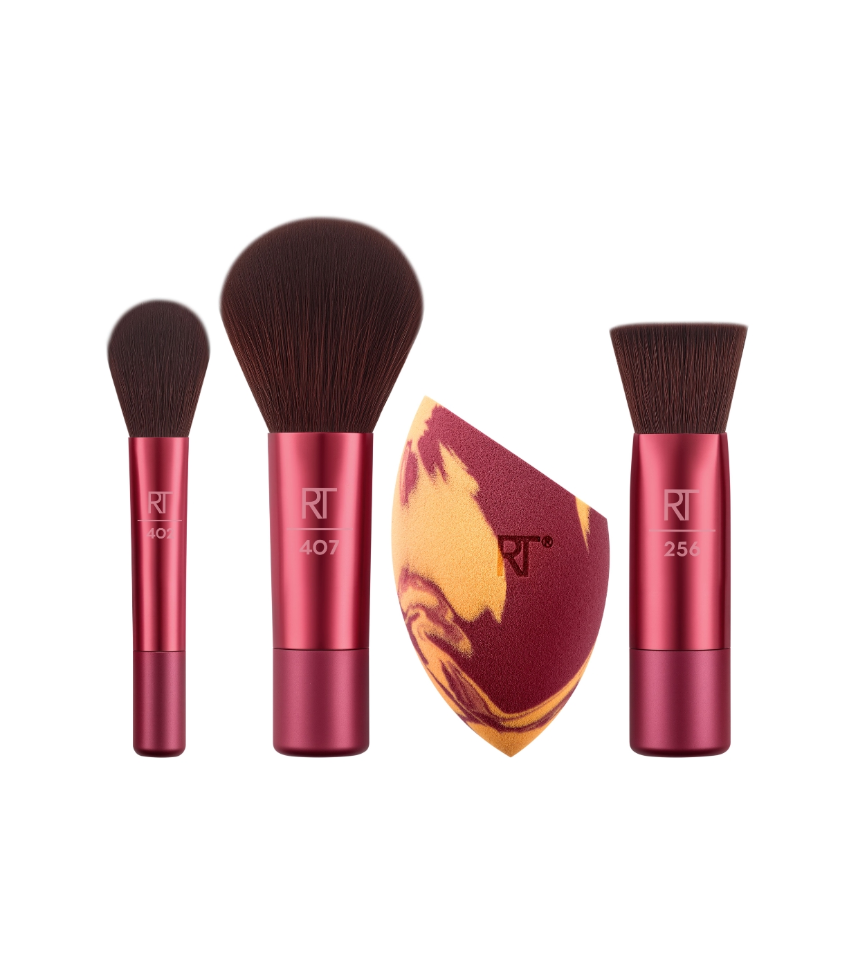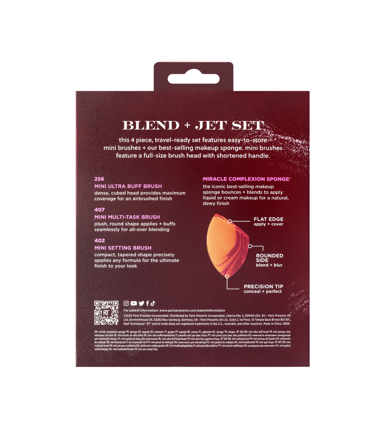 Lleva siempre contigo tus básicos de maquillaje con este set de 4 piezas Blend + Jet Set de Real Techniques en formato mini, diseñado para facilitar tu rutina en cualquier lugar.