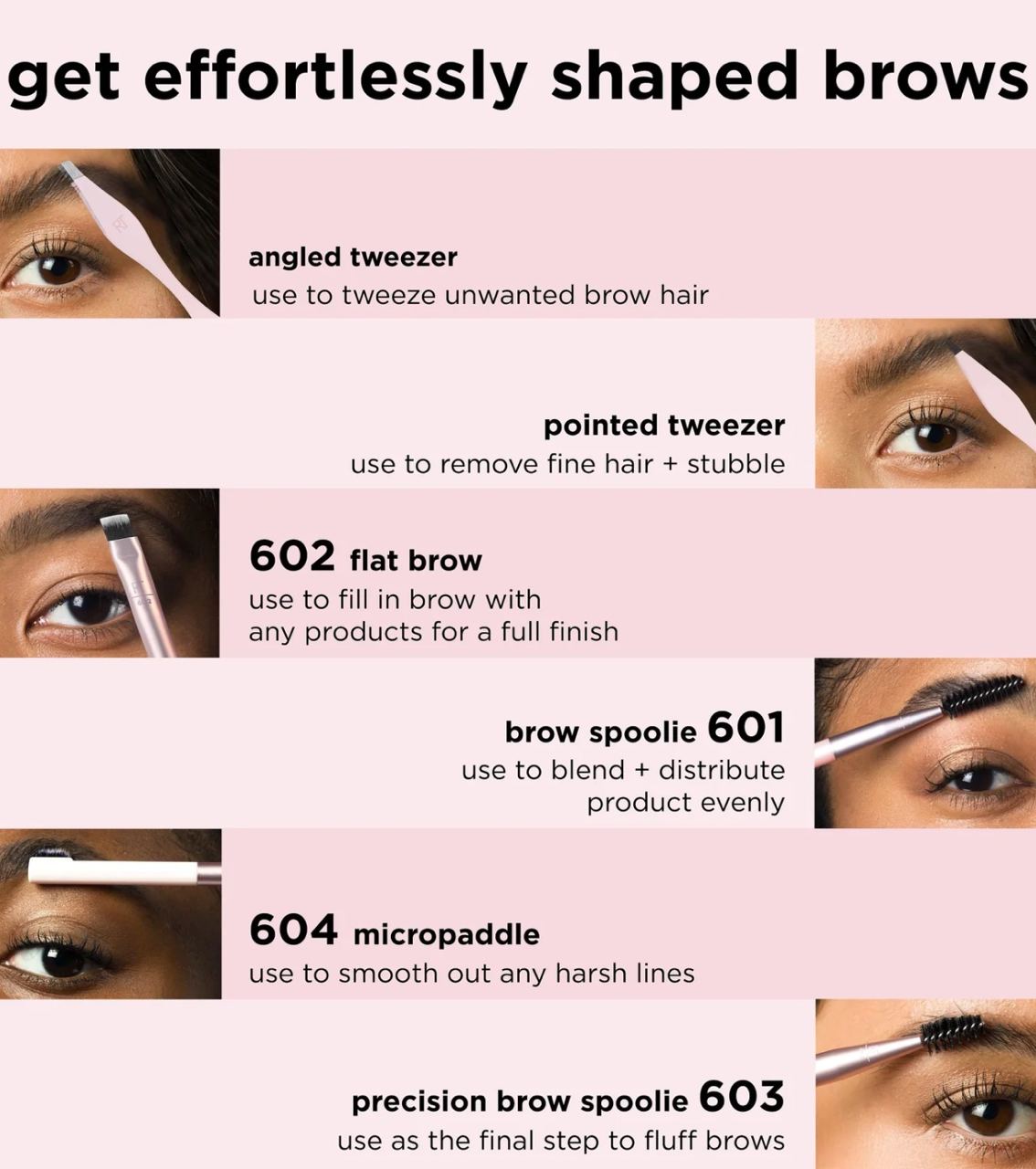 El kit para dar forma a las cejas incluye todas las herramientas necesarias para recortar, domar y dar forma a las cejas rebeldes. Depila con pinzas el vello no deseado de las cejas, rellénalas con precisión y difumina todos los productos a la perfección. Estas herramientas se utilizan mejor con sombras, geles y cremas para cejas.