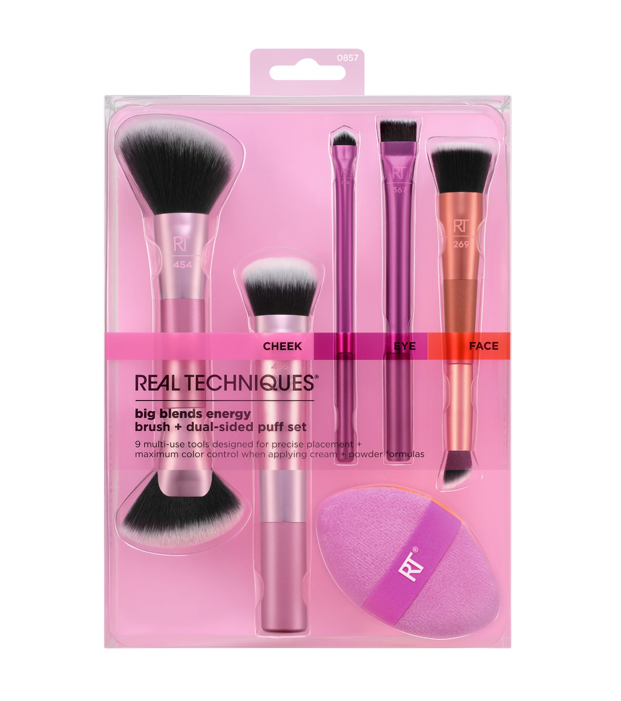 El set de brochas para ojos y rostro Real Techniques Big Blends Energy, incluye 6 herramientas multifunción diseñadas para ofrecer una aplicación precisa y un control máximo del color.